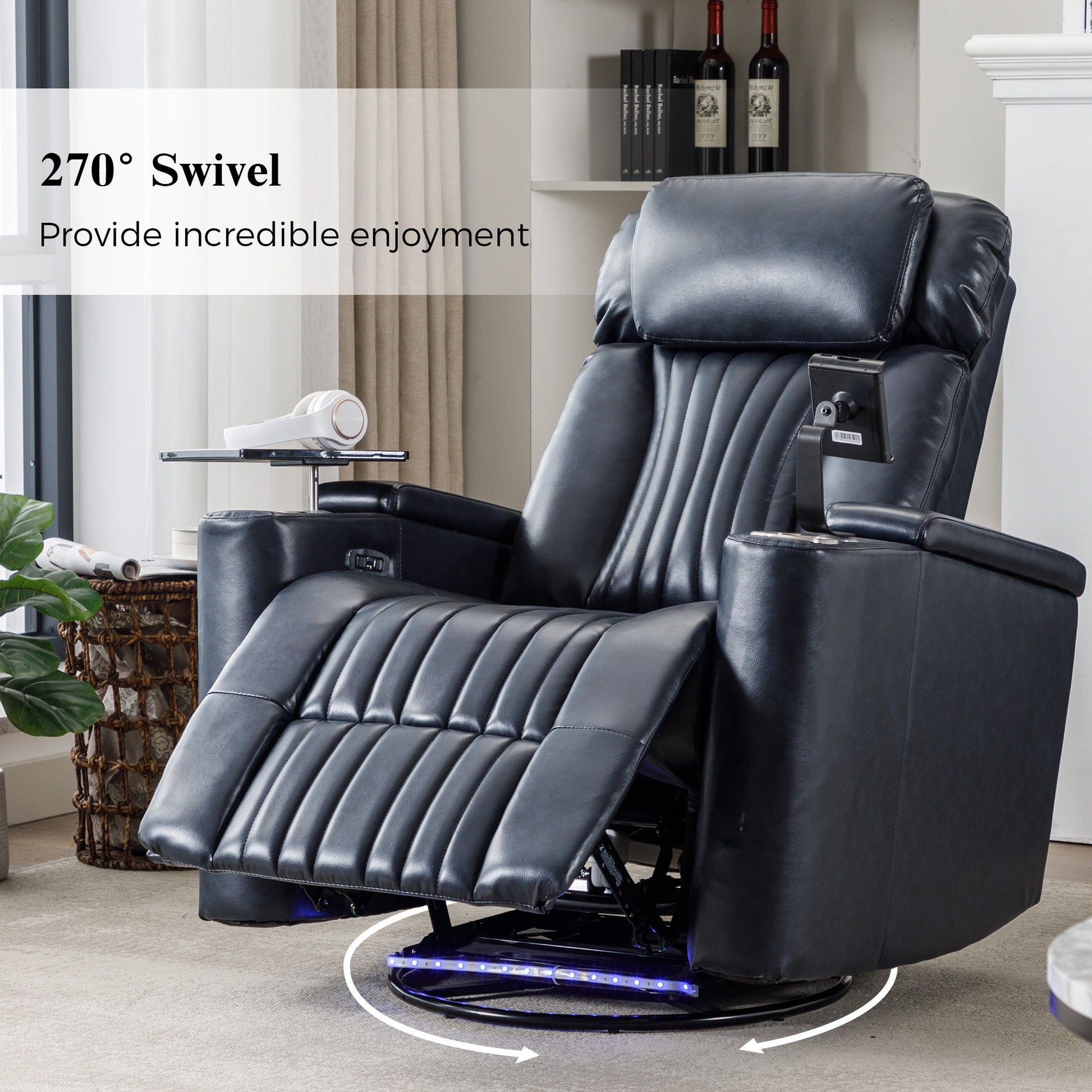 Power Swivel Recliner Home Theater Seating With Hidden Arm Storage, LED Light Strip, Cup Holder, 360 Degree Swivel Tray Table, Cell Phone Holder - Blue