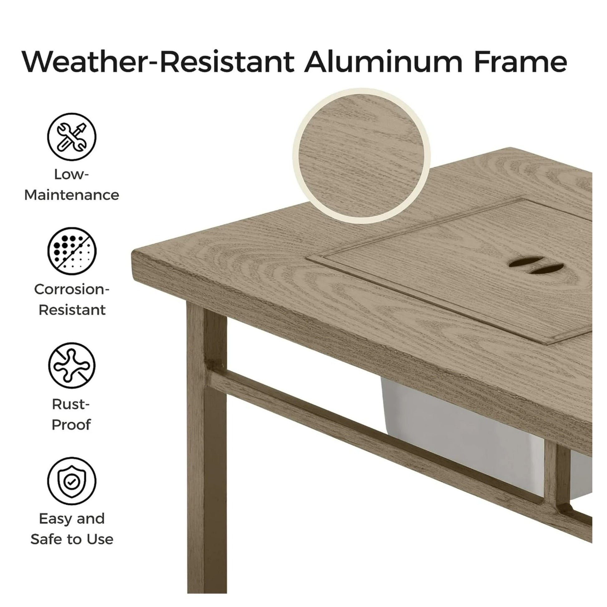 - Rust-Proof Aluminum Construction: Durable frame and wood-grain top resist weather and impacts