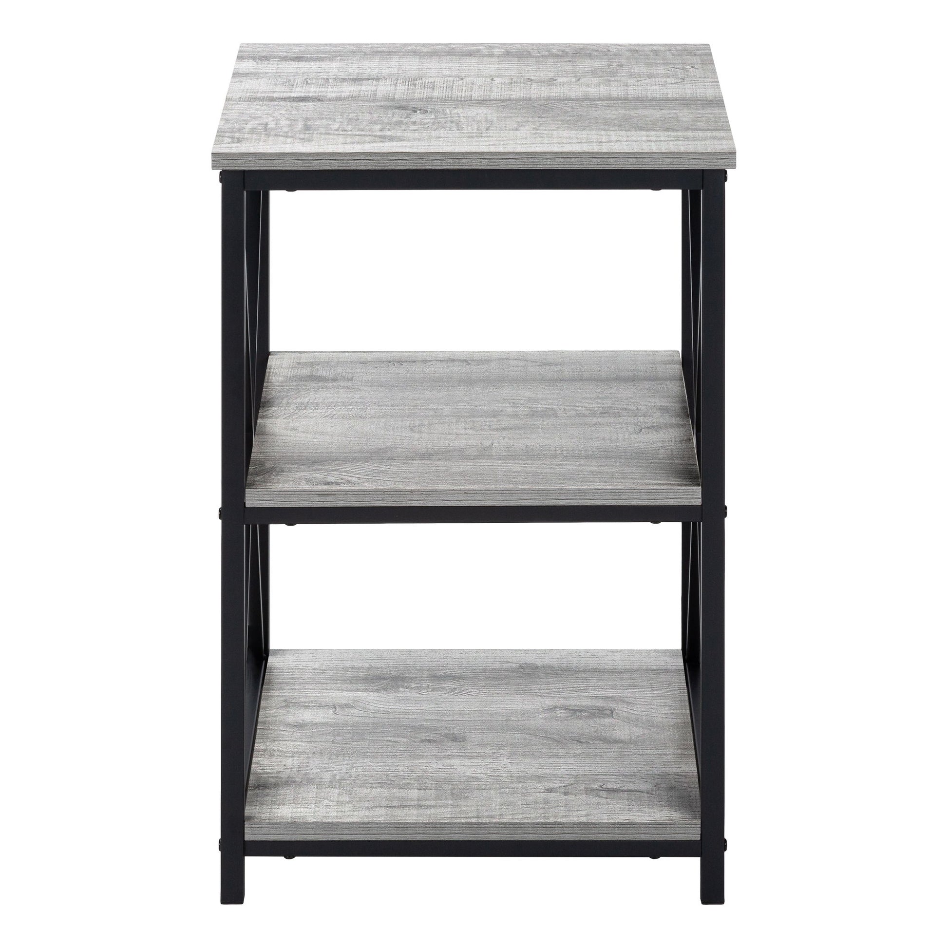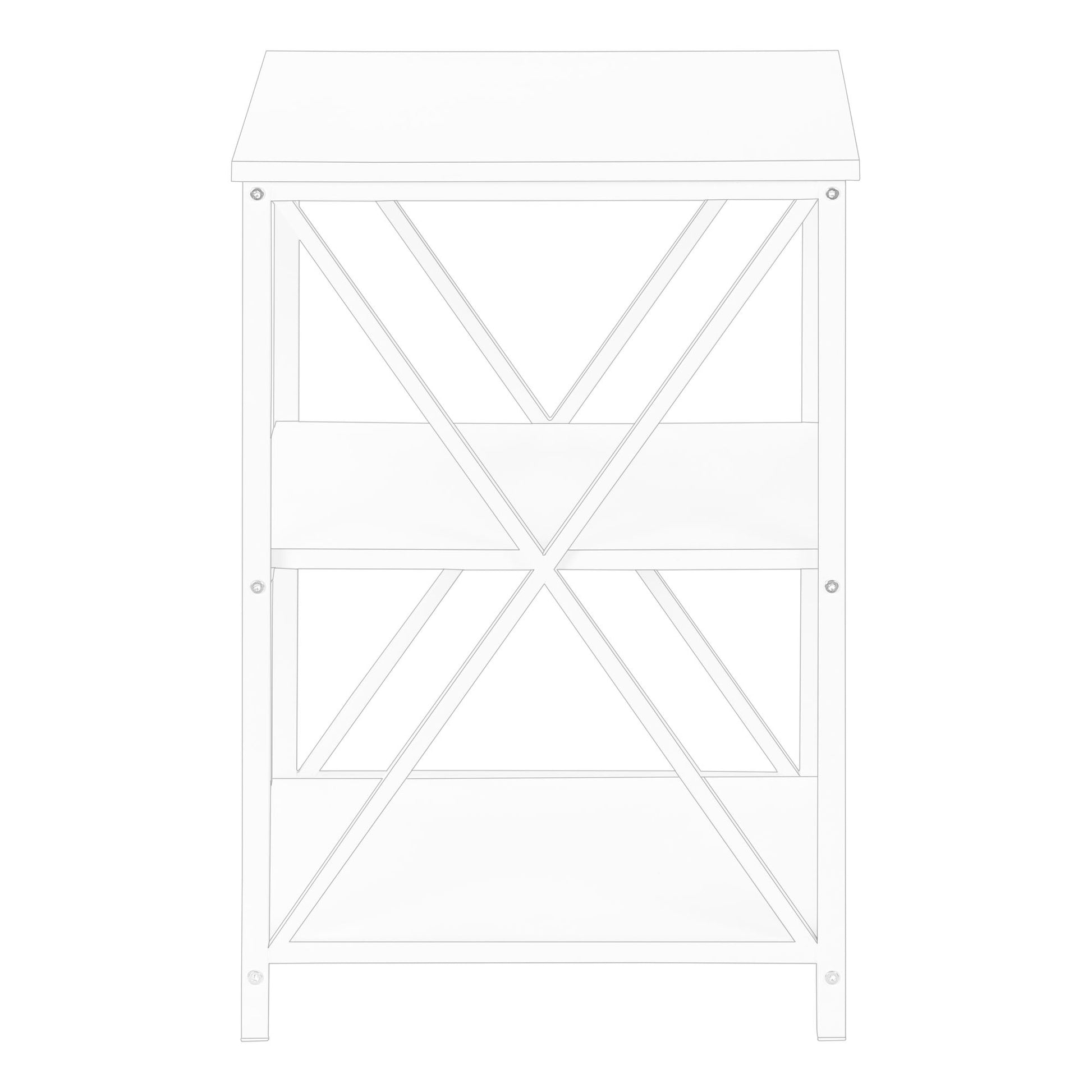 - Design and Finish: This 3-tier accent table features a square tabletop and two storage shelves with a sleek finish. The slender yet sturdy metal base has an X-shaped design on the sides, adding a decorative touch.