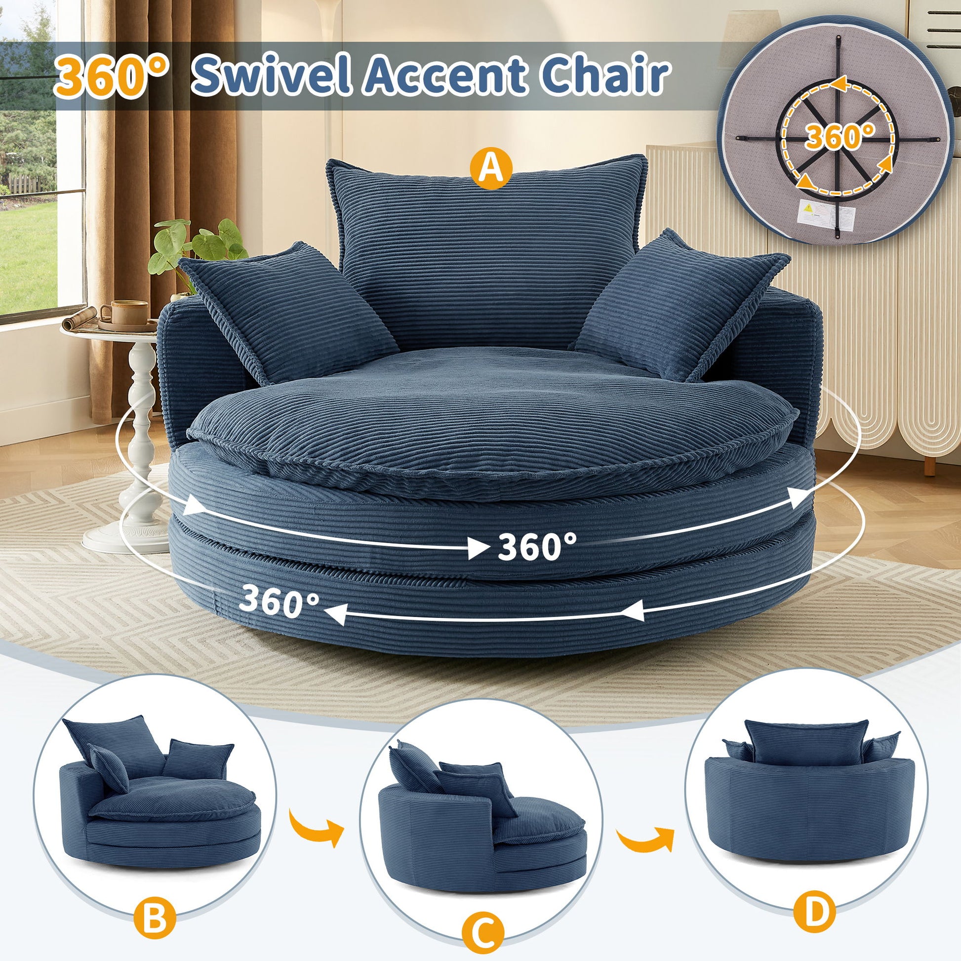 - Dual-Layer Cushion with Deep Seating: Designed for extended lounging, this oversized round swivel chair features a generous 38-inch seat depth that allows you to fully stretch out or curl up in total comfort.