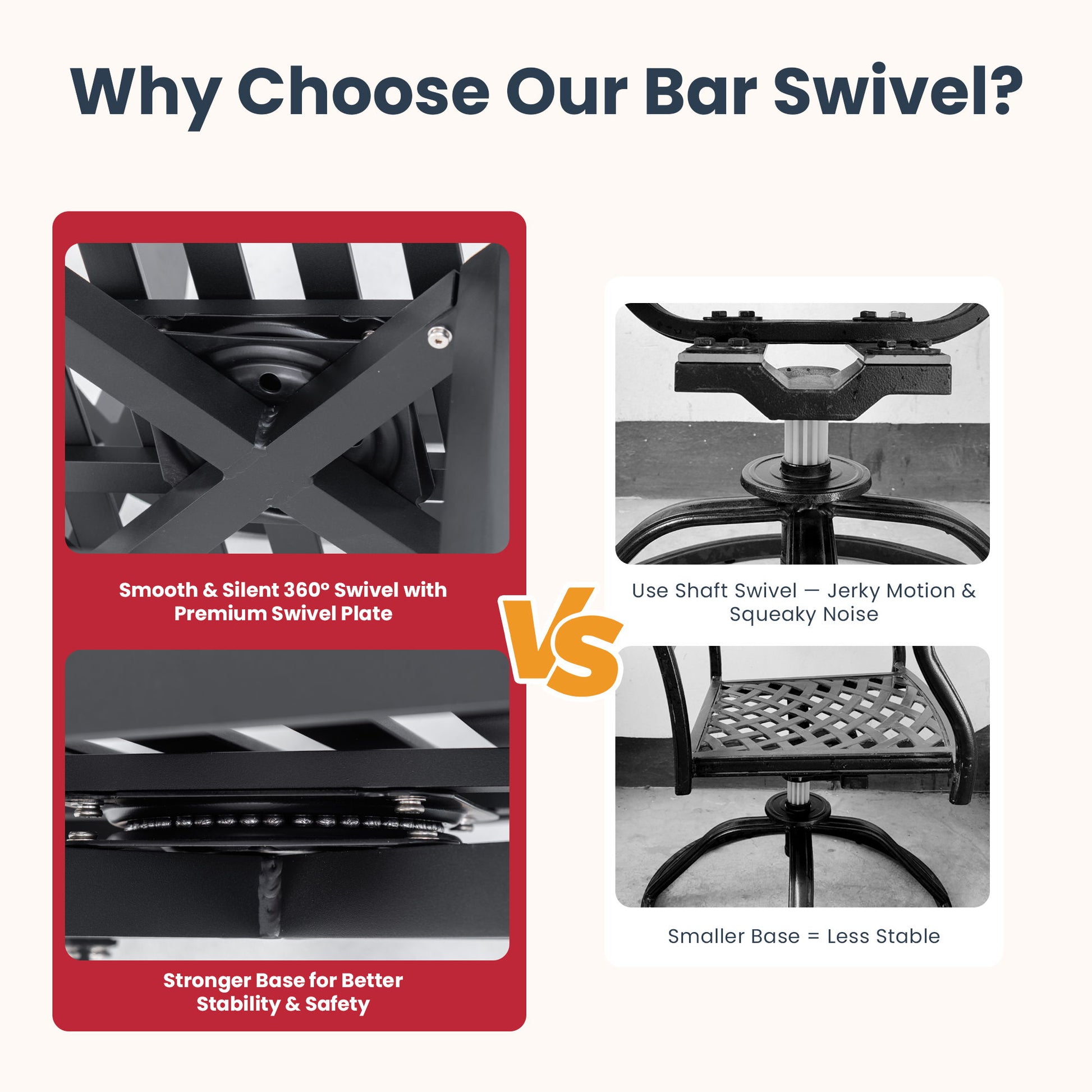 - Stable and Safe: Tapered legs and expanded swivel plate provide superior stability and weight support.