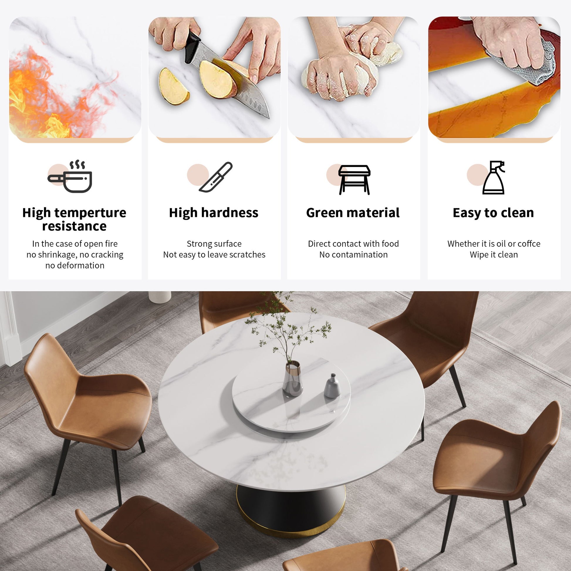 - Durable Surface: Sintered stone tabletop is resistant to burns, stains, and scratches.