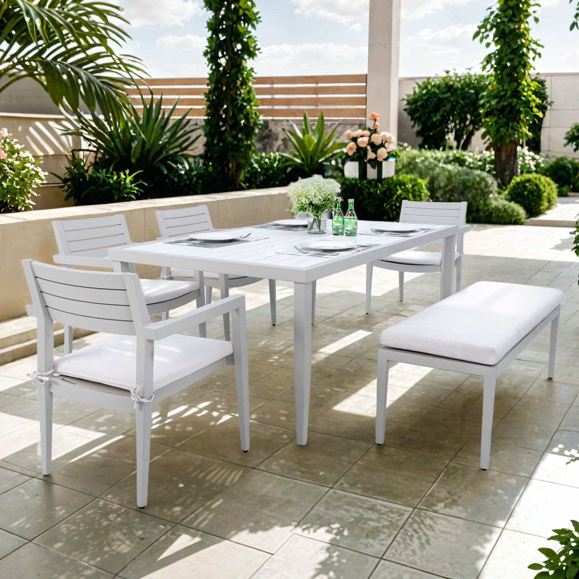 6 Piece Dining Set Modern Outdoor Patio Furniture, 4 Dining Chairs & 1 Dining Bench Sunbrella Fabric And 2 Tone Rectangle Table With Umbrella Hole - Matte White / Grayish