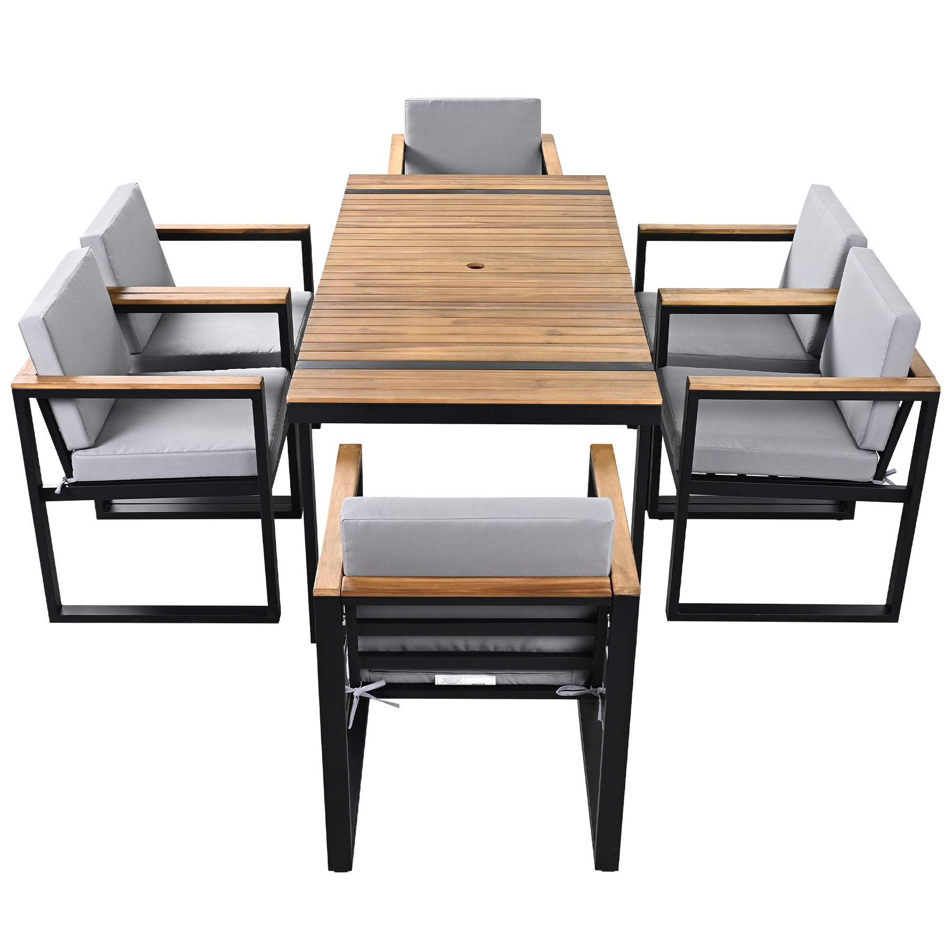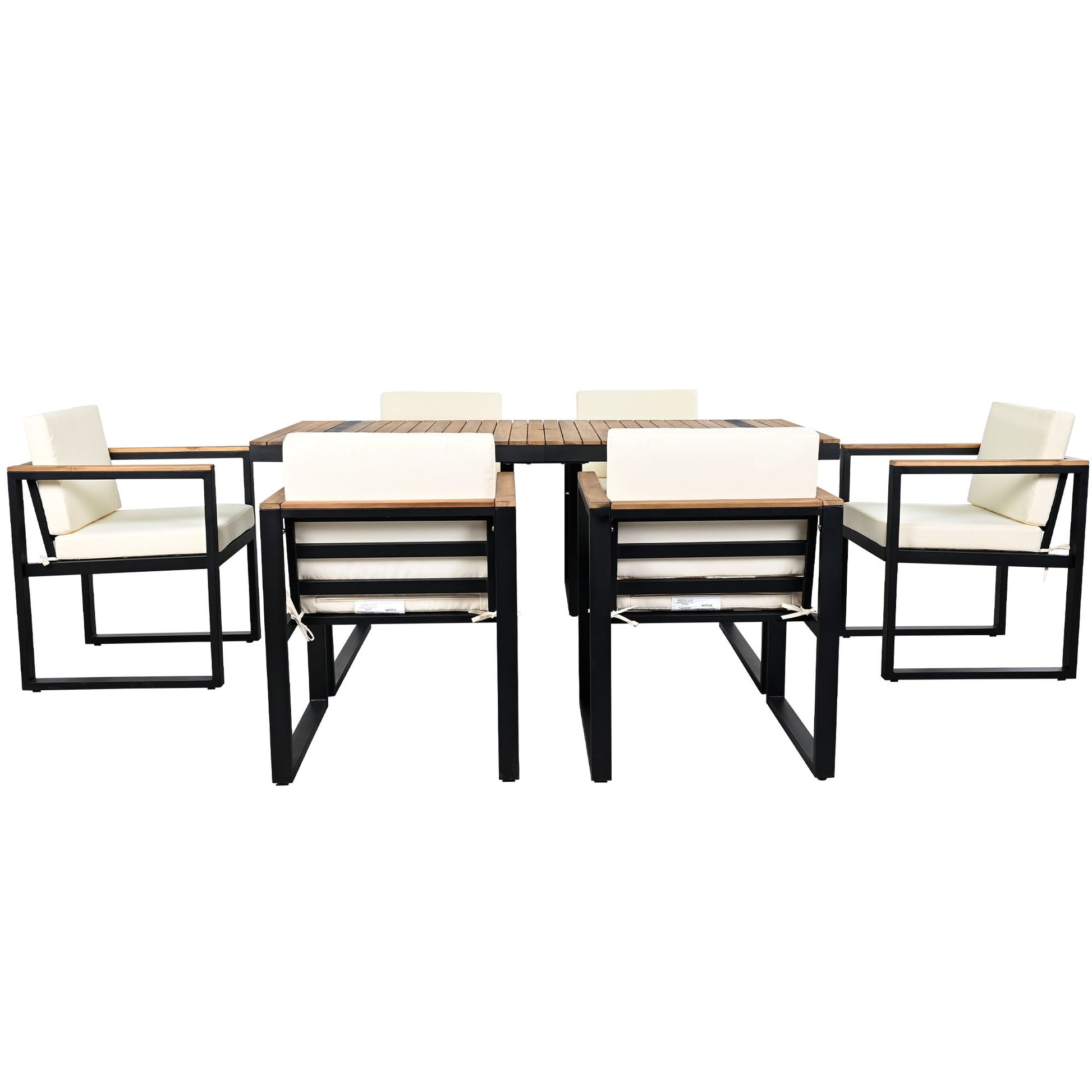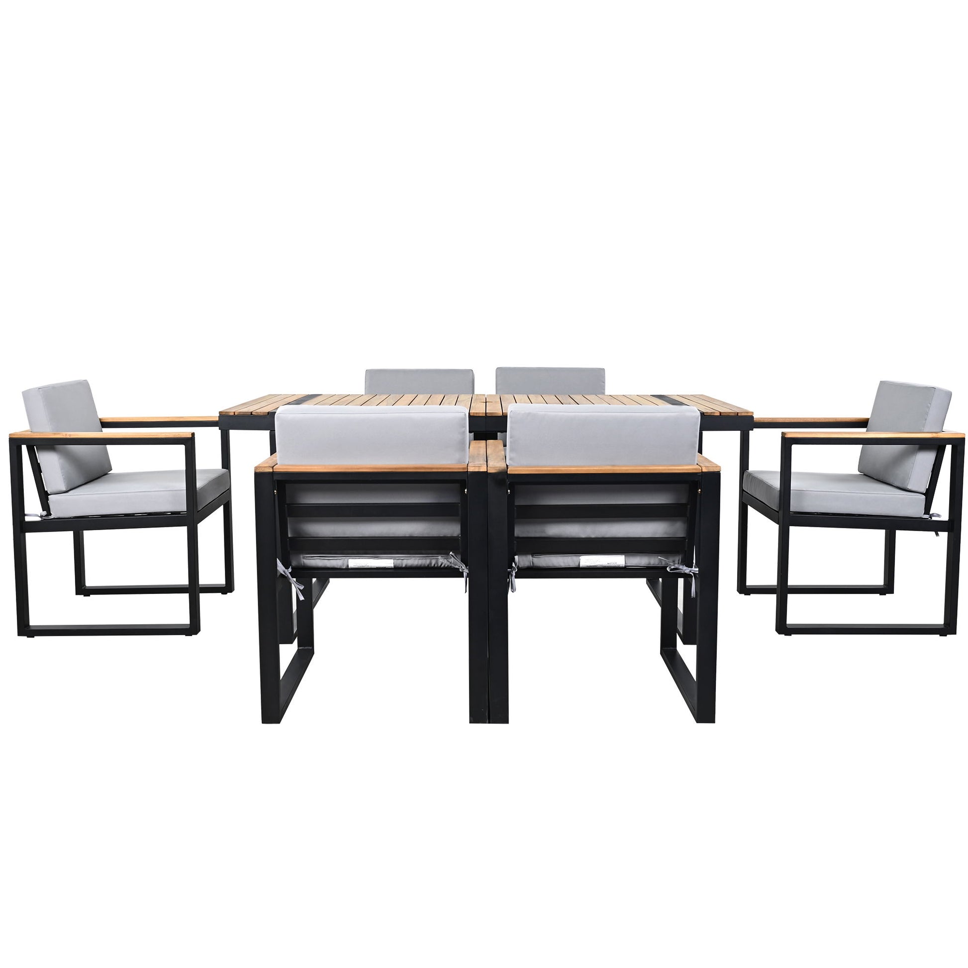 - Stylish Design - This 7-piece outdoor dining set features a sleek, contemporary design that blends seamlessly with various outdoor settings. The combination of acacia wood and steel, along with high-density foam cushions, gives the set a modern, minimalist appearance, perfect for patios, gardens, or balconies.