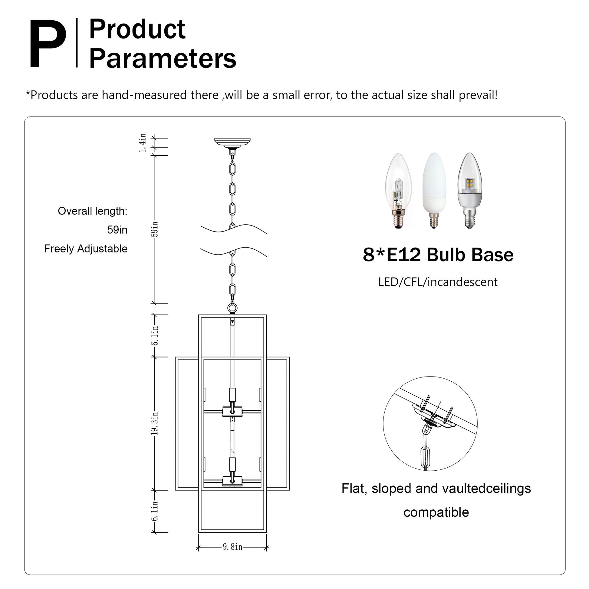 - Bulb Compatibility: The chandelier is equipped with 8 E12 socket bases, supporting bulbs with a maximum power of 25W each, ideal for creating tailored lighting solutions.