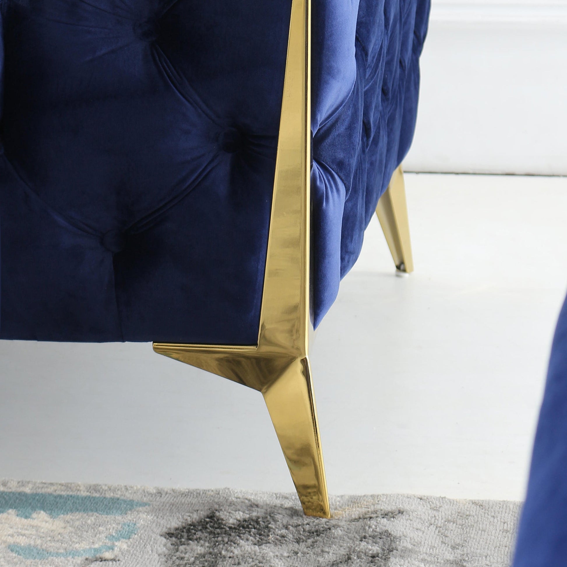 Experience luxury and comfort with this stunning velvet armchair, loveseat, and sofa set. Designed with a solid wood structure and upholstered in rich, 100% polyester velvet, this collection adds a touch of elegance to any living space. The high-density foam cushions ensure superior comfort, while the sleek gold metal legs provide a contemporary flair. Available in sophisticated shades of black, grey, or blue, each piece is perfect for creating a cozy yet modern ambiance in your home. Assembly is required, but the result is well worth the effort. Whether you're furnishing a small space with the armchair or going big with the full sofa, this collection has a size that fits your needs.