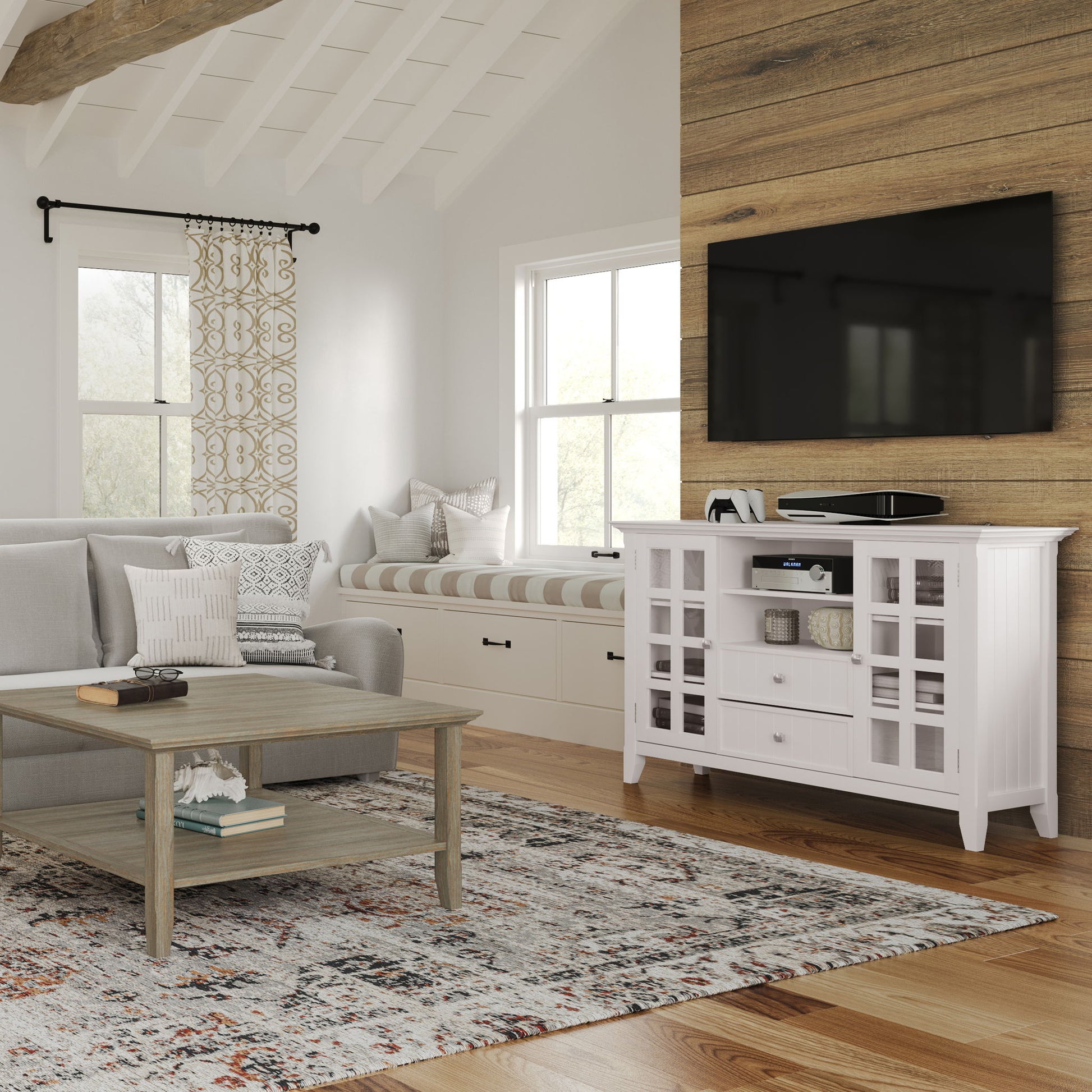 - Transitional design includes grooved sides and brushed bronze knobs, extra wide TV Stand is perfect for TVs up to 60 inches