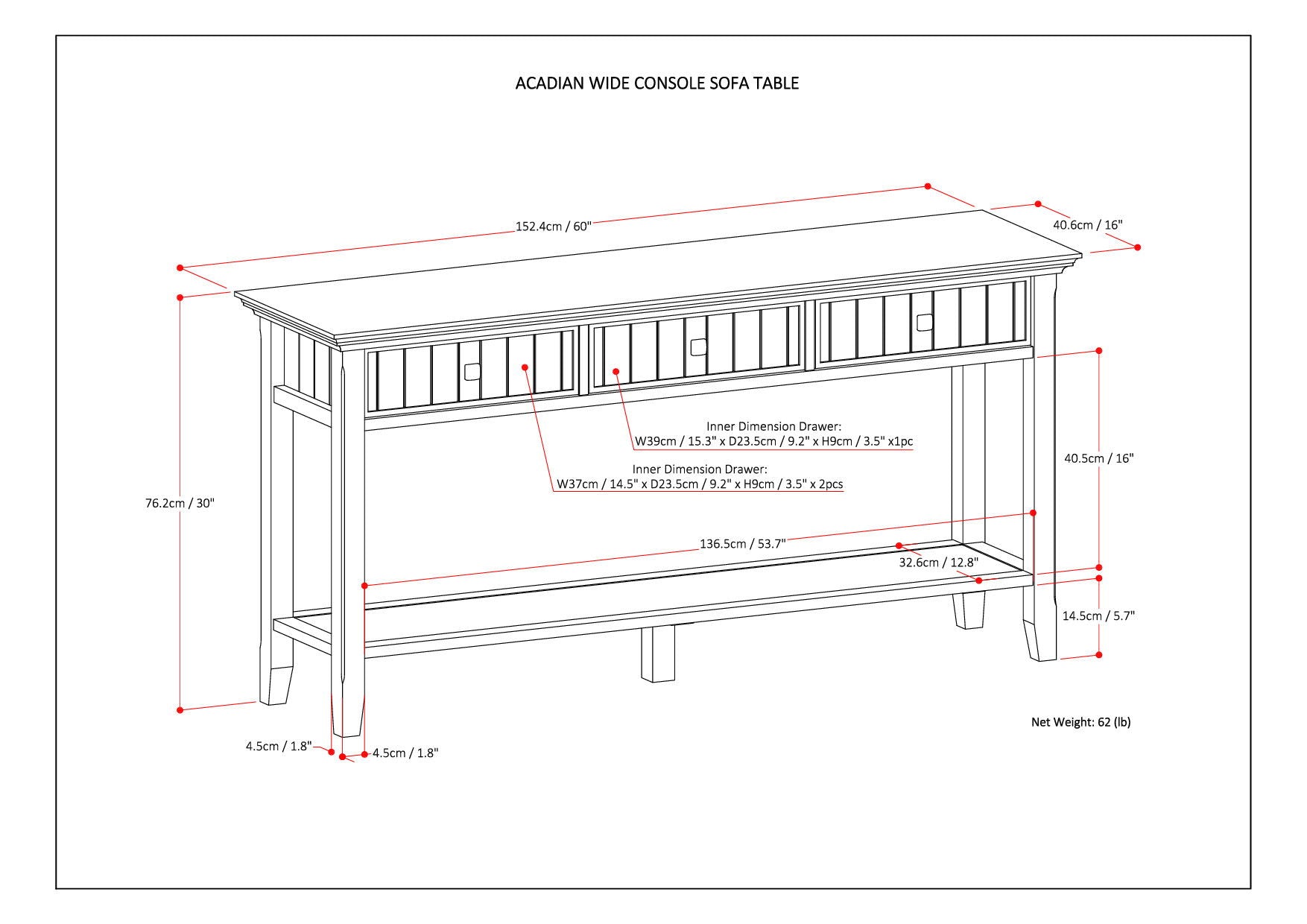 60.0"W x 16.0"D x 30.0"H - 66.1 lb