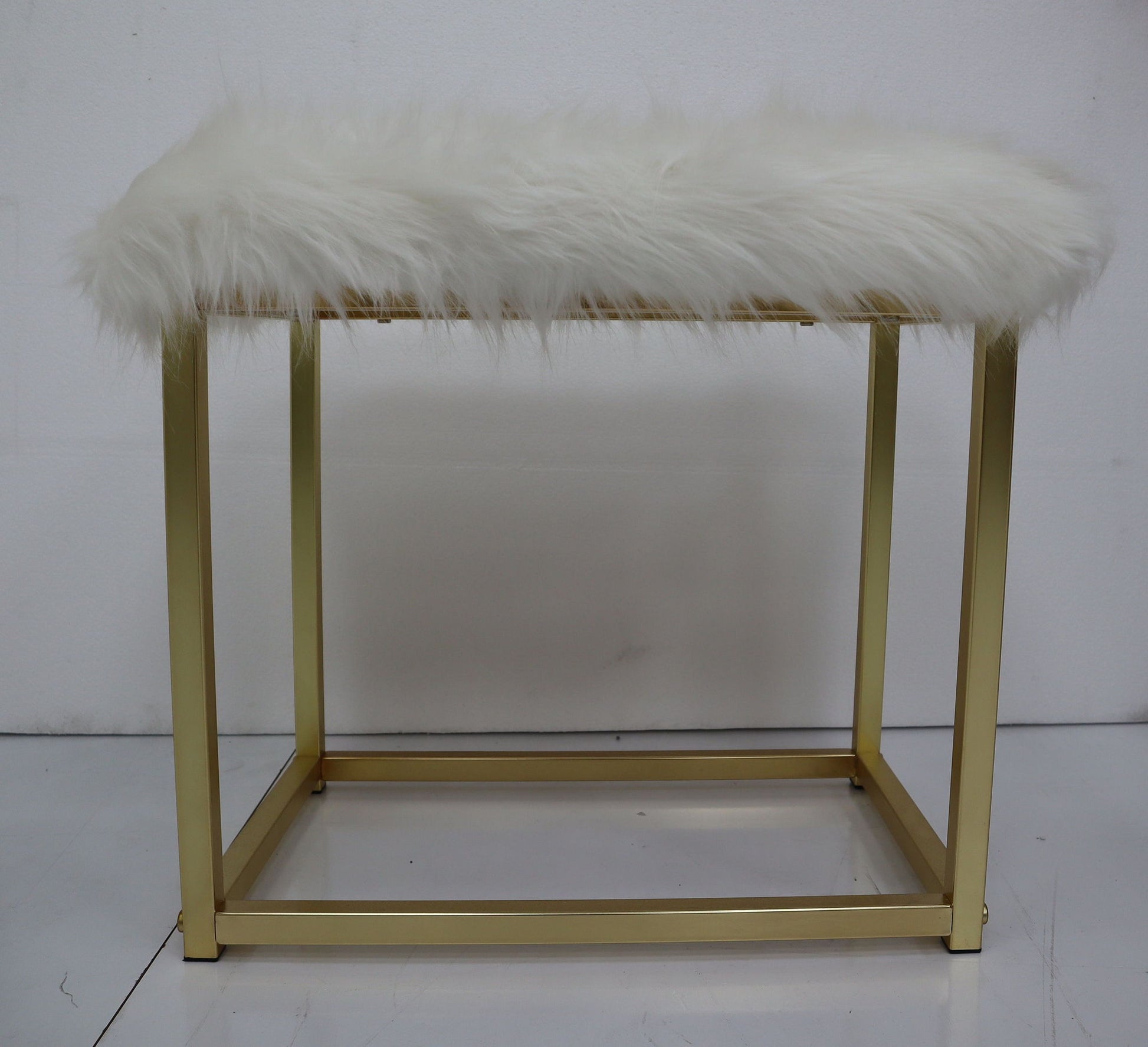 Adao - Vanity Mirror & Stool - Faux Fur, Mirror, White & Brass