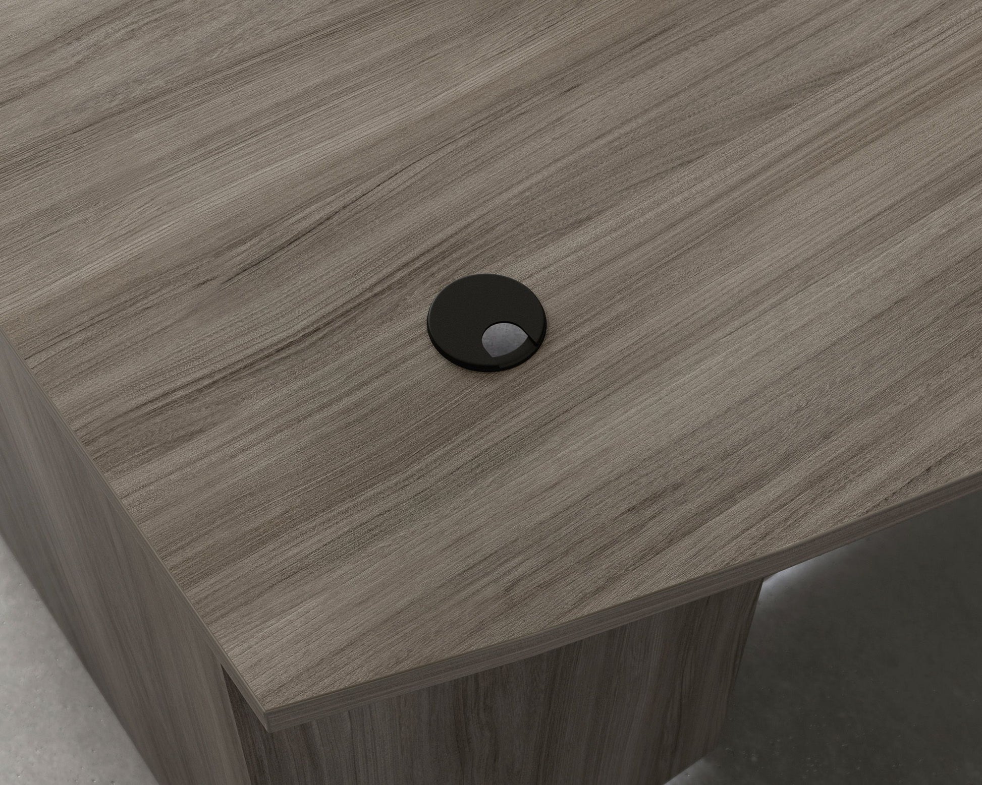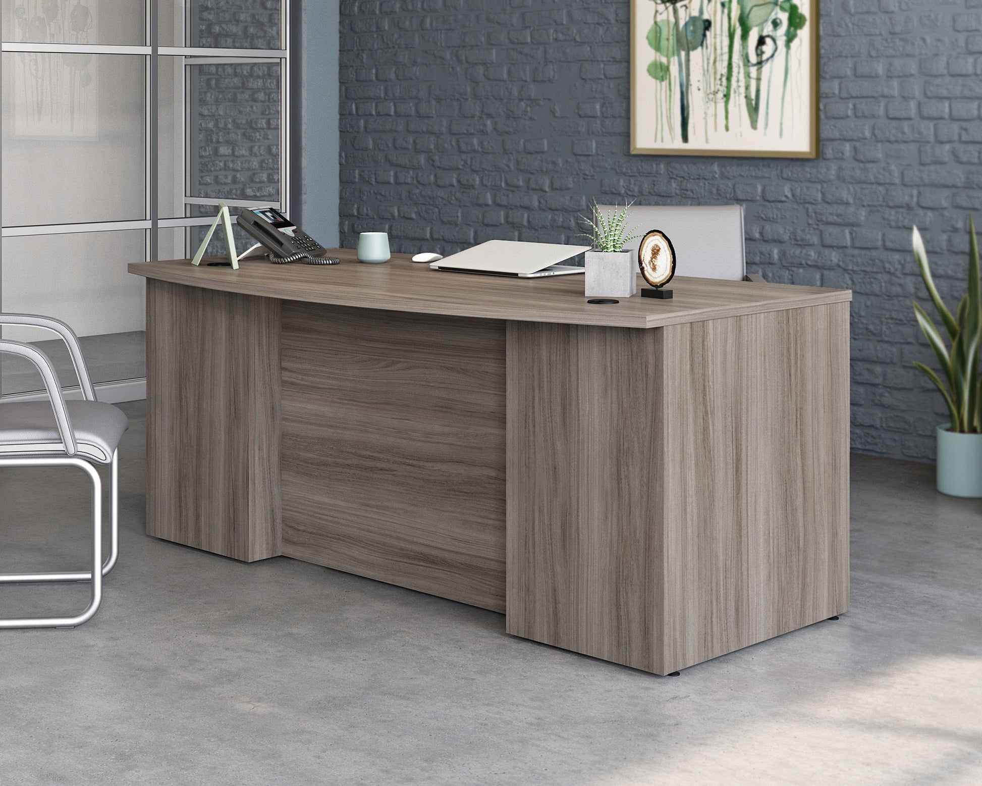 A modern look with a design that you know and love. The 72" x 36" bowfront executive desk from the Affirm collection pairs a new finish with the epitome of executive desk design. A durable, 1" thick top gives this executive office desk a spacious top surface for your laptop, photos of your family, to-do list, file organizer, and more. The resilient melamine top surface is heat, stain, and scratch-resistant, with impact resistant, high-grade thermoplastic edges ensuring your 72" desk stands up to the toughest task you may have. This commercial executive desk includes a cord management system with two desktop grommet holes to guide and organize cords to help reduce cord clutter. Office desks with storage, like this one, include adjustable levelers that keeps your desk level with uneven flooring, and aligns additional pieces to fit just right. Finished in Hudson Elm, pair bow front desks, like this one, with file peds to create an office desk with storage options giving you the ultimate office bundle.