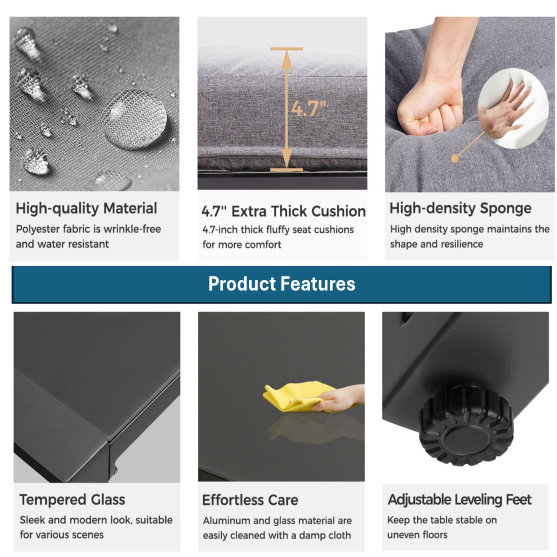 - Thick High-Density Cushions: Plush, resilient foam cushions maintain shape over time, providing lasting comfort for extended lounging.