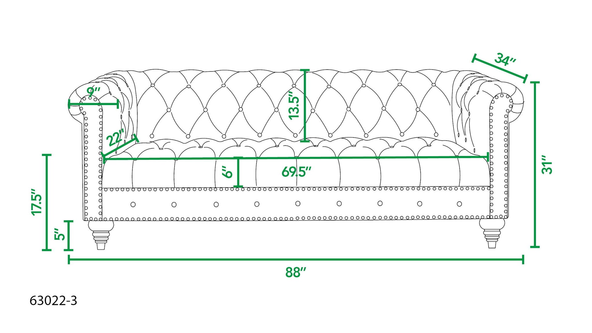 - Elegant Accents: The sofa boasts hand-applied iron nailhead accents with an antique brass finish, along with button tufting along the arms, seat, and seat back for a classic touch.