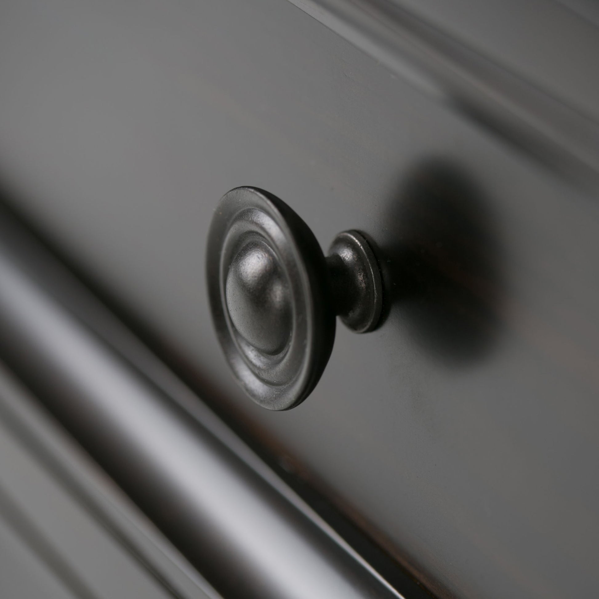 - Transitional Design includes tapered legs, molded crown edged table top, panel framed drawer fronts, metal drawer glides and Antique Pewter round decorative knobs