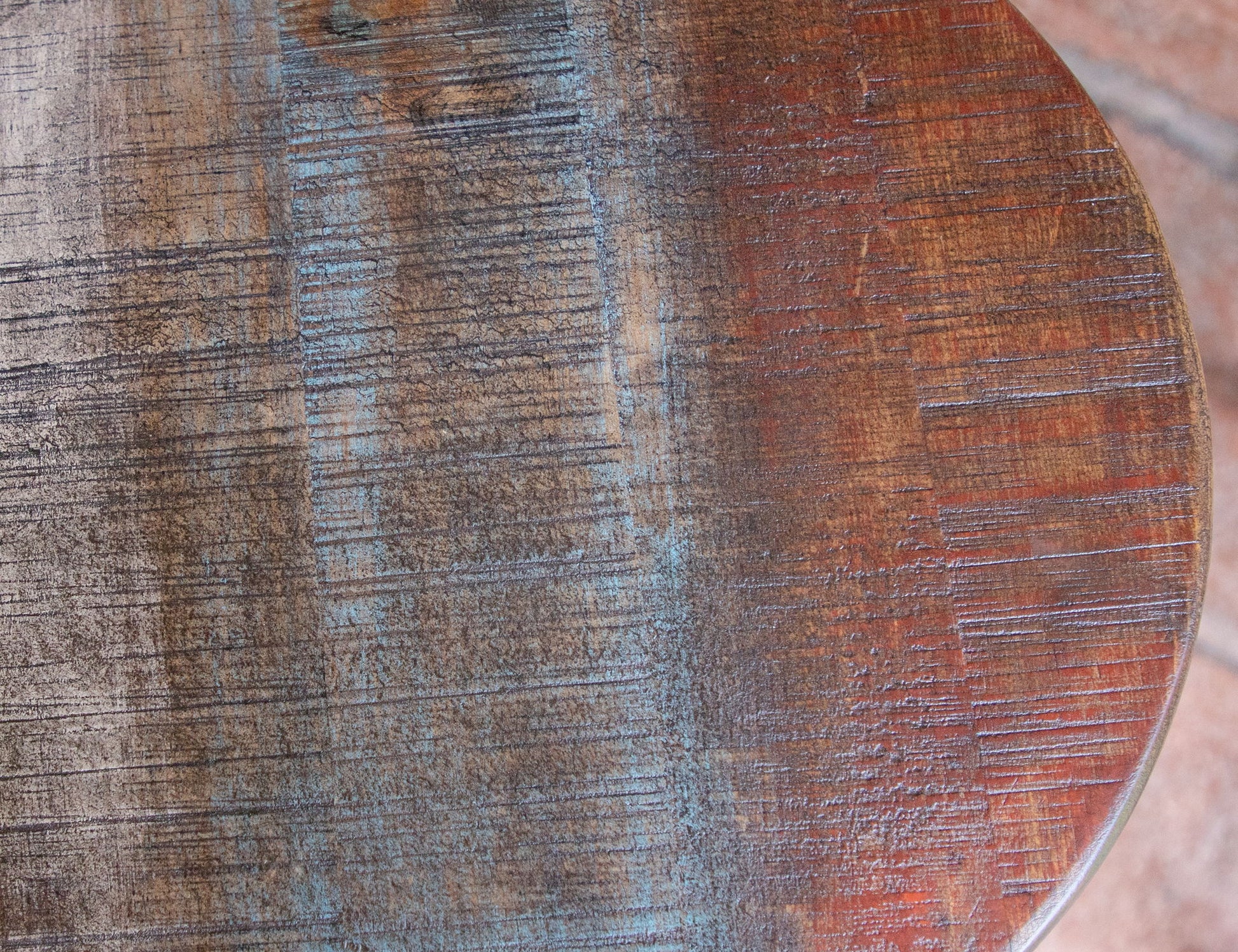 - Multi-step, soft multi-colored finish on hand distressed wood, complemented by a rust finish on the iron base.