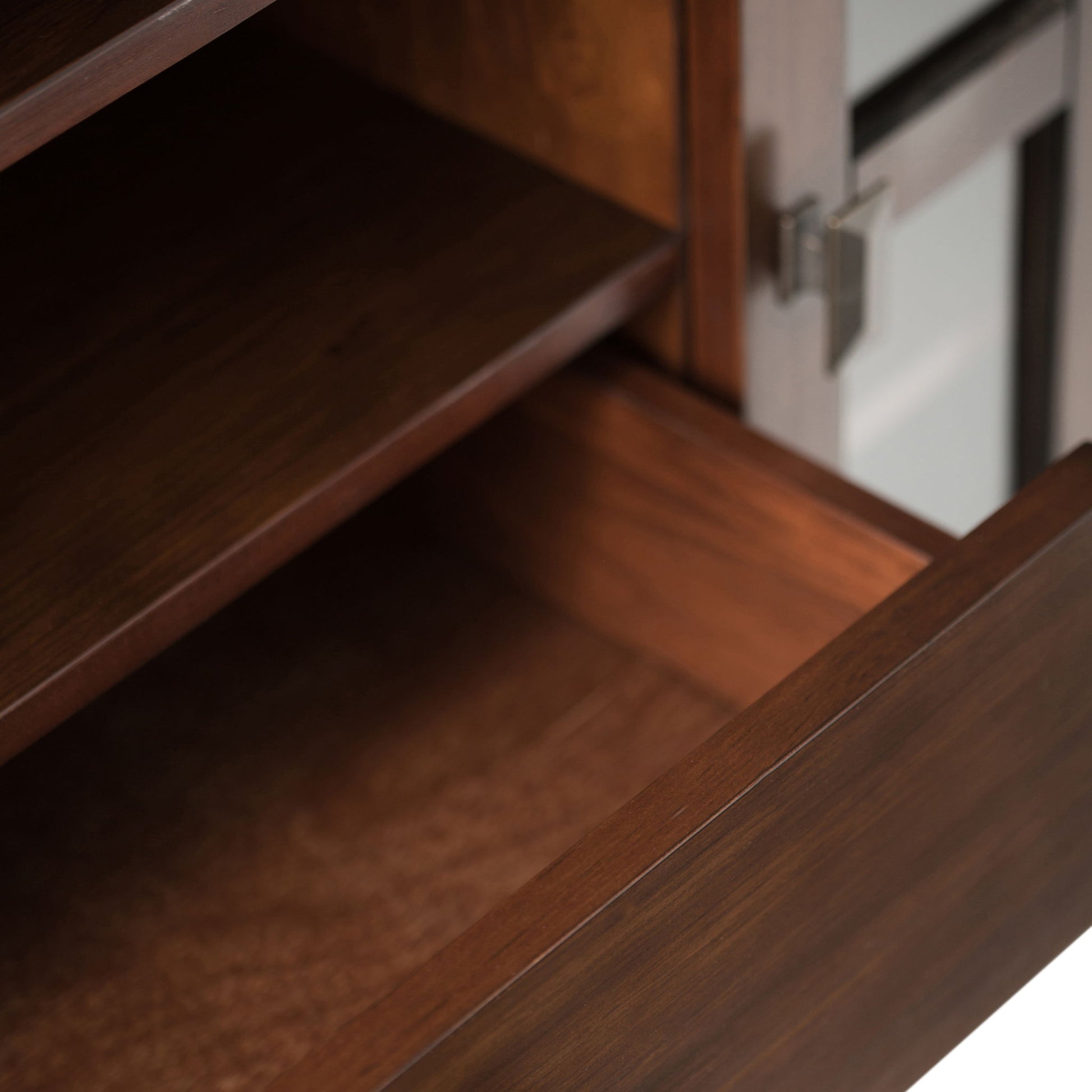 - Features two (2) central drawers with metal glides, open center area with adjustable shelf and two (2) side tempered glass framed doors that open to large storage spaces with two (2) shelves each