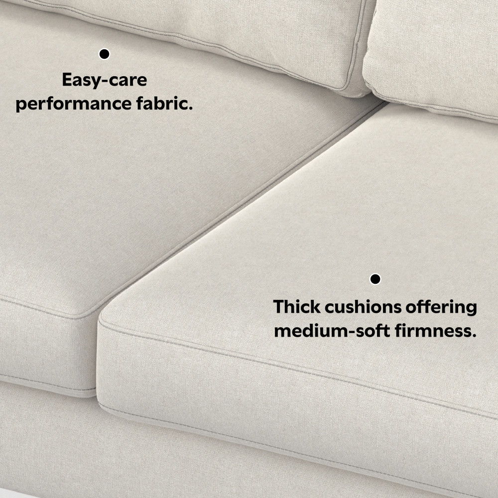 - The 2 large, square throw pillows and 6 loose, reversible, extra-thick back cushions are stuffed with a combination of feather and fiber filling for a softer feel, while the armrests are covered in foam padding for a cozy seating experience.