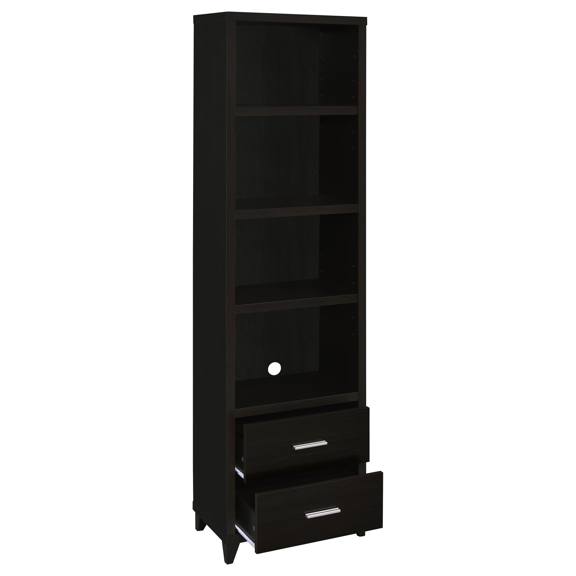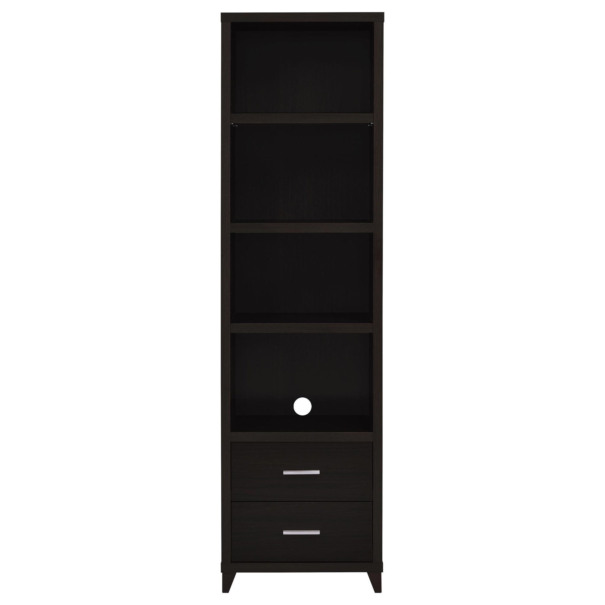 - Media Towers with Multiple Shelves: Provides four tiered storage levels and two drawers per unit for organized media and accessories