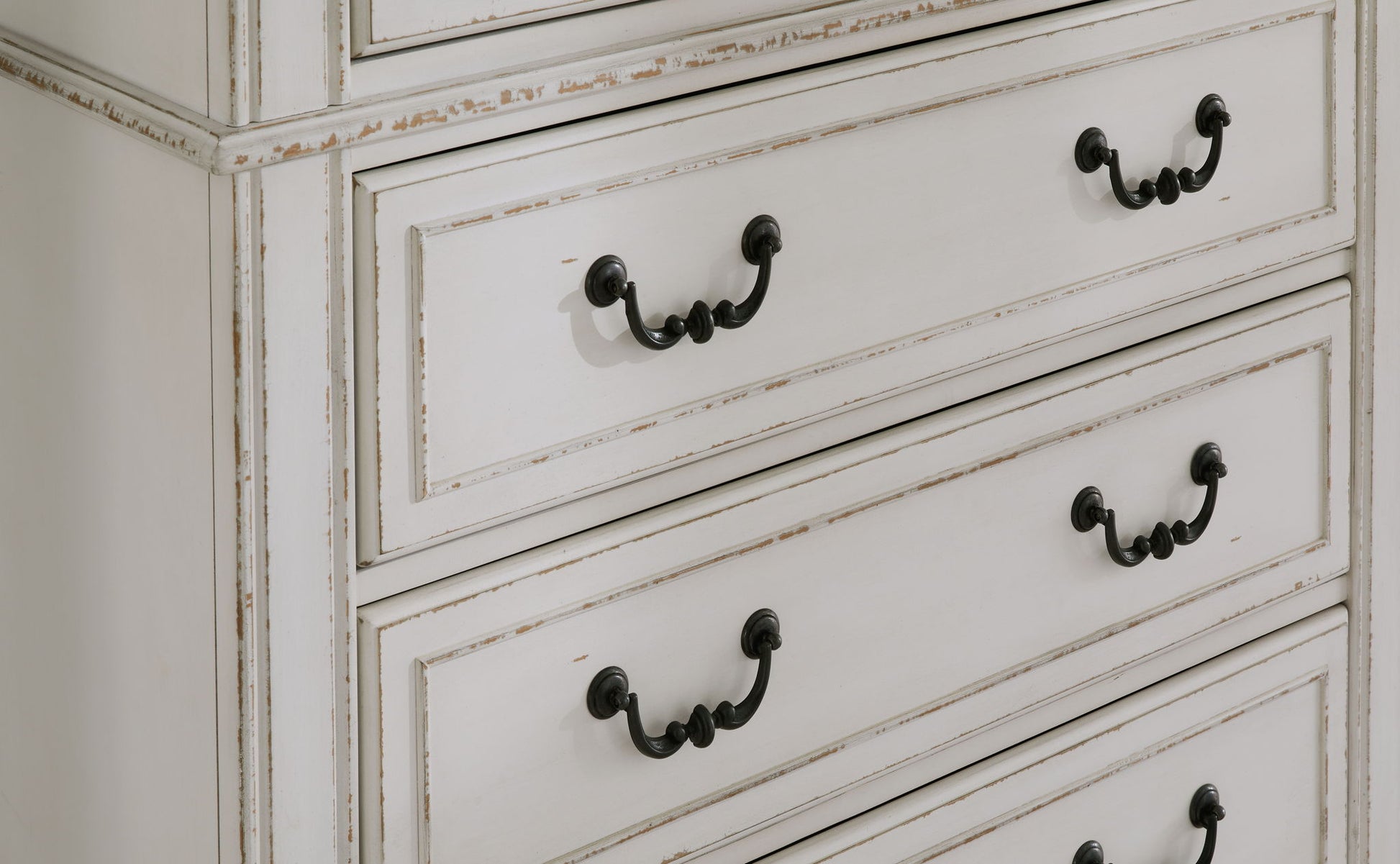 - 5 smooth-gliding drawers with fully finished interiors, dovetail construction and metal ball-bearing side glides (top drawer felt lined)