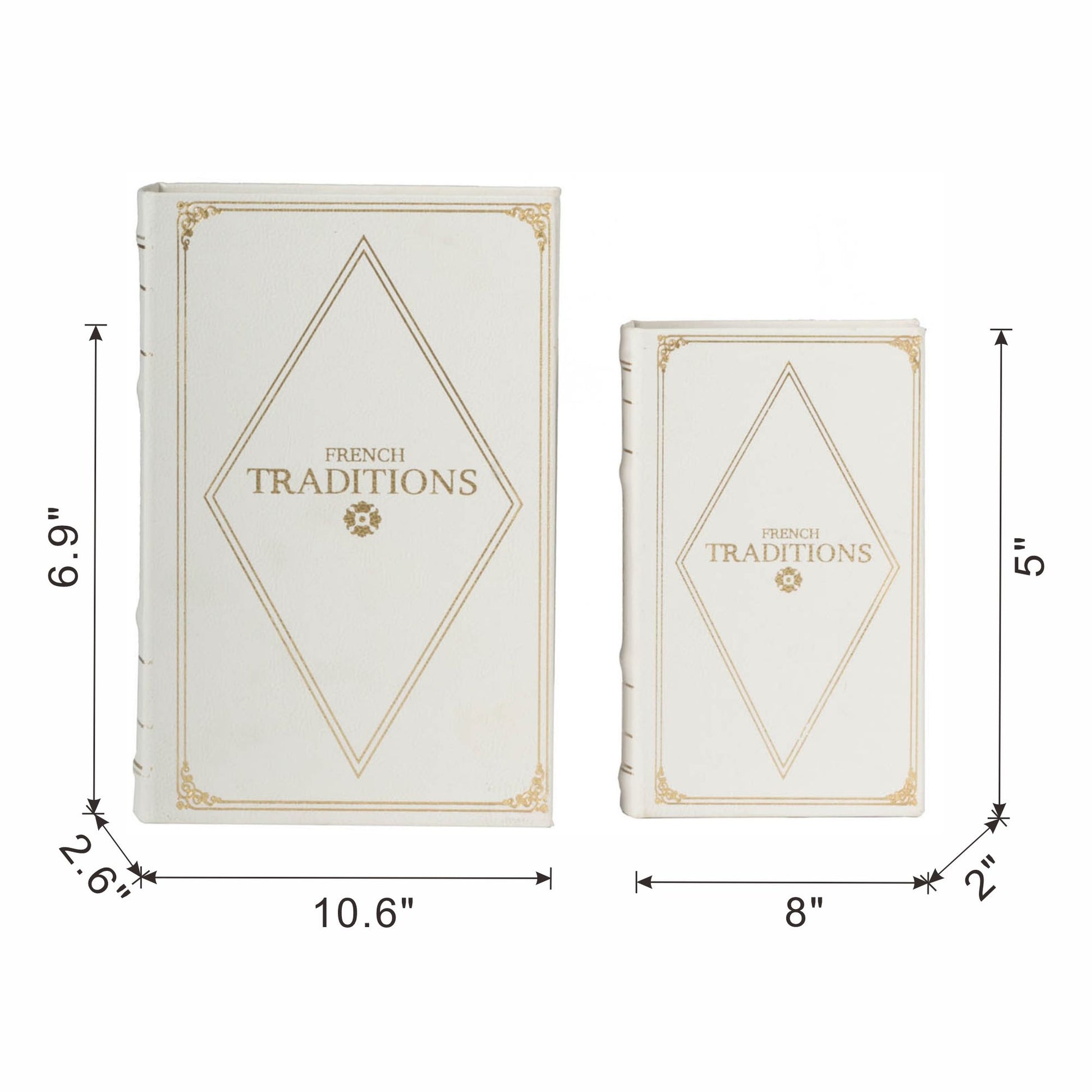 - Stylish Storage: Adorable pair of book boxes with faux leather covers in white and gold, printed with "French Traditions".