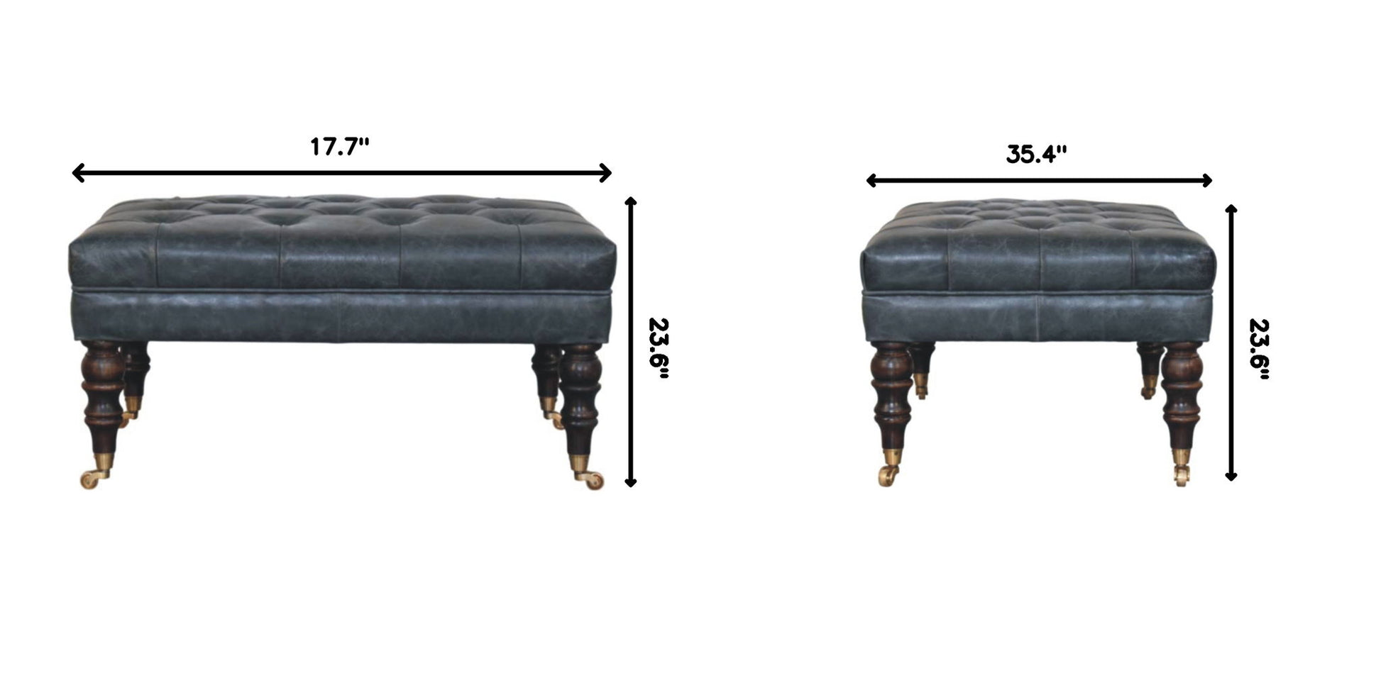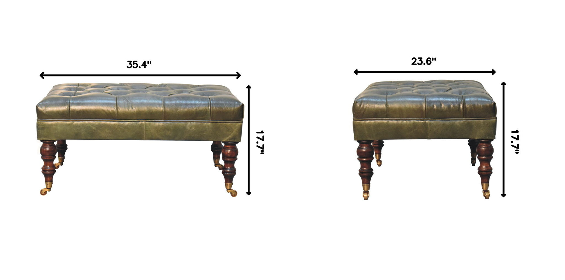 - Buffalo Leather Ottoman With Castor Legs - Combining comfort and practicality, this ottoman is upholstered in 100% buffalo hide leather, radiating luxury and durability. Crafted from 100% solid mango wood, its sturdy construction harmonizes strength with elegant grains. Hand-turned feet, finished in light, add stability and artisanal charm. With a deep-buttoned top, it's both a statement of sophistication and a functional addition to your home.