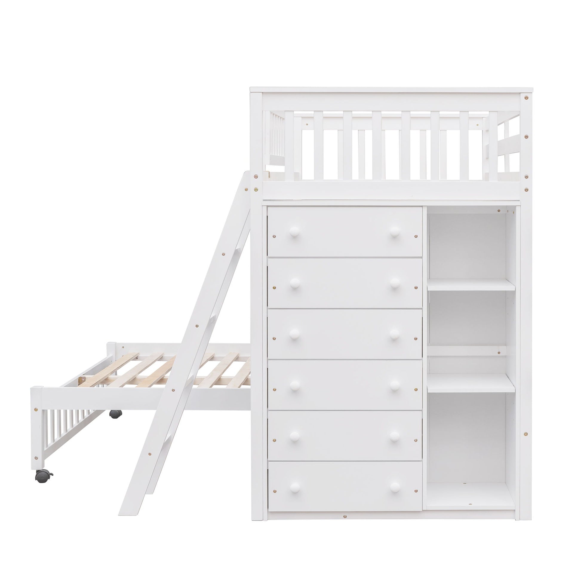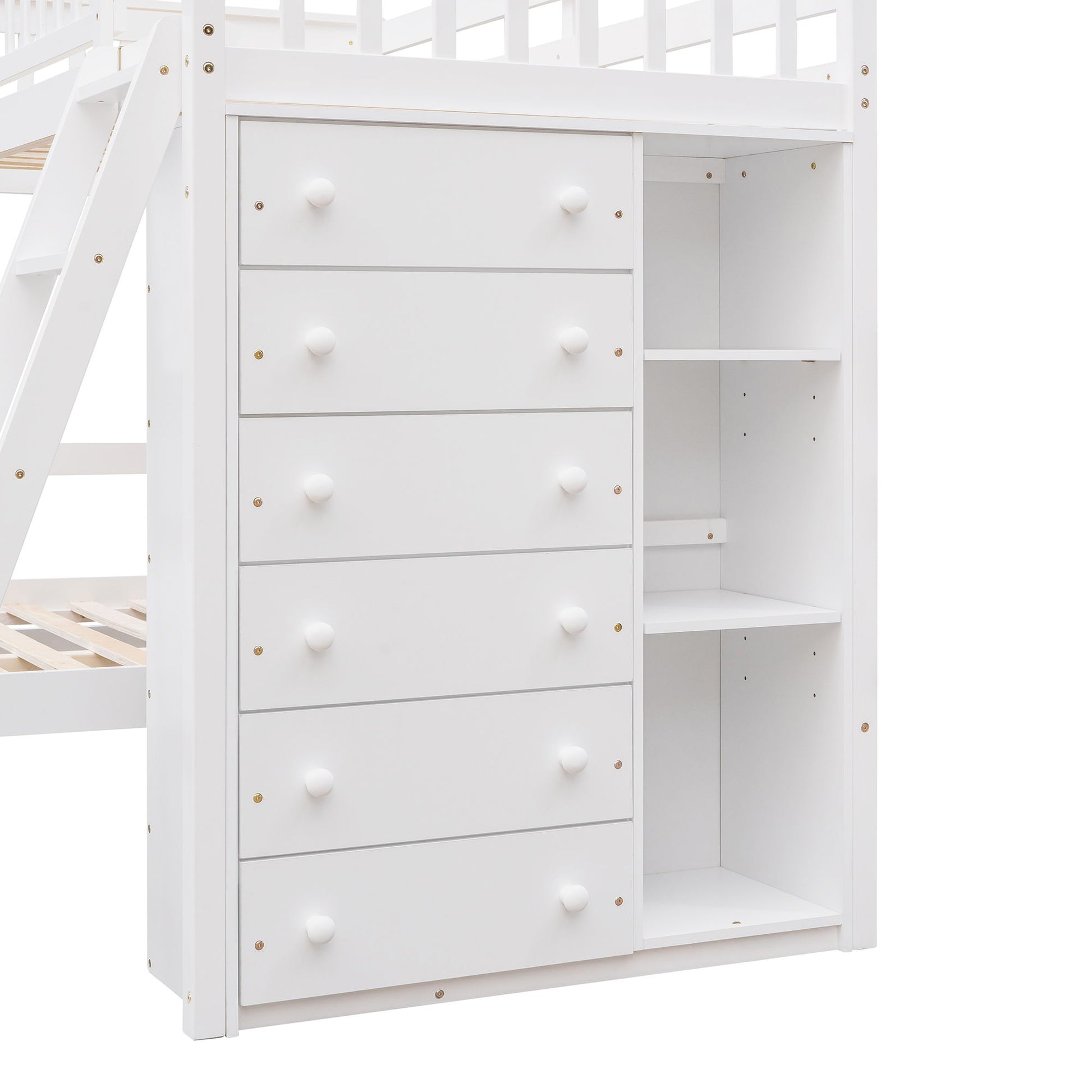 Twin Over Full Bunk Bed With 6 Drawers And Flexible Shelves, Bottom Bed With Wheels - White
