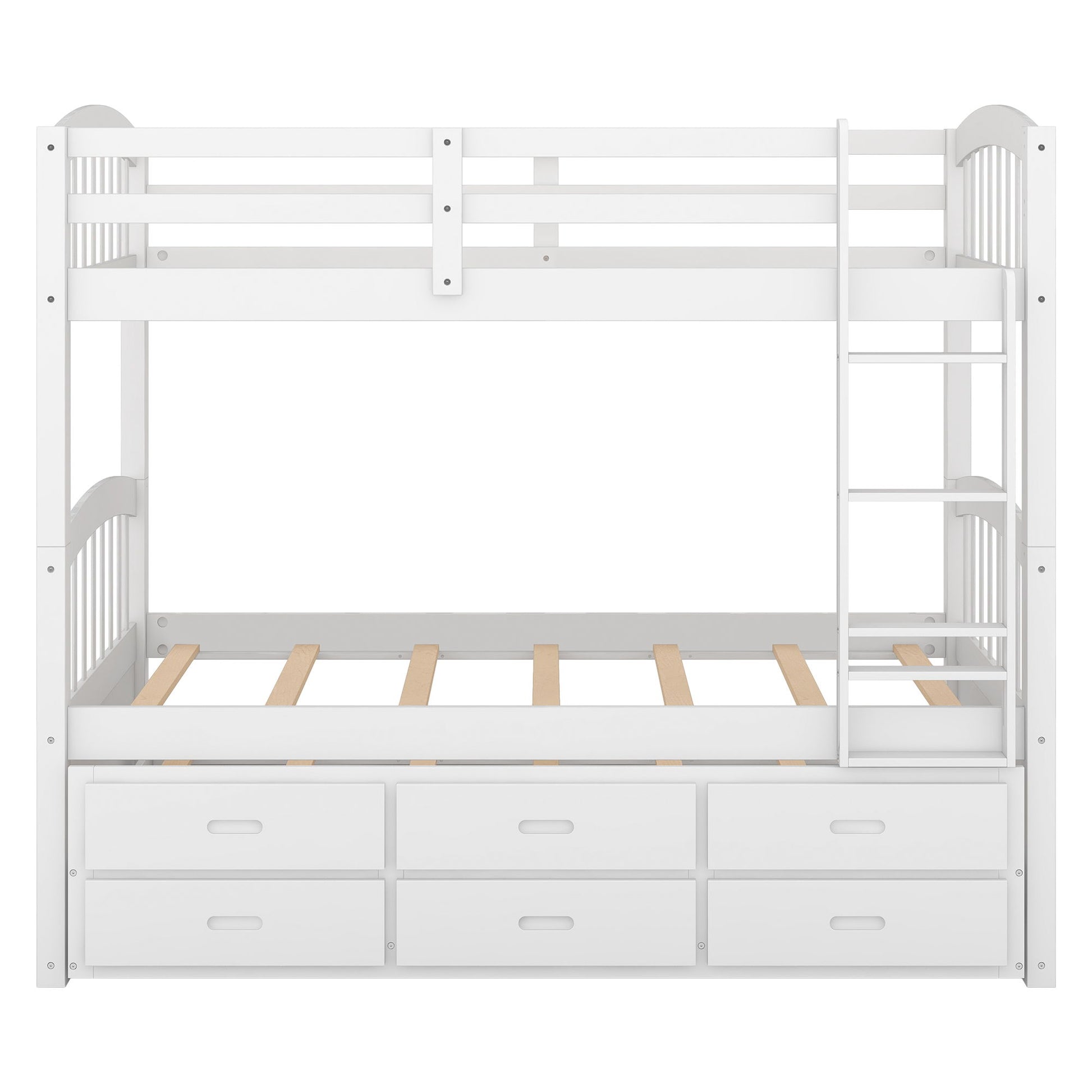 Twin Over Twin Bunk Bed With Trundle And Drawers With Arched Headboard And Footboard - White