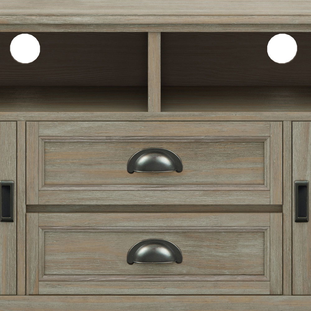 - Features two (2) centrally located open areas with two drawers as well as two (2) framed doors with enclosed spaces; the two (2) large side storage cabinets open to one adjustable shelf each.