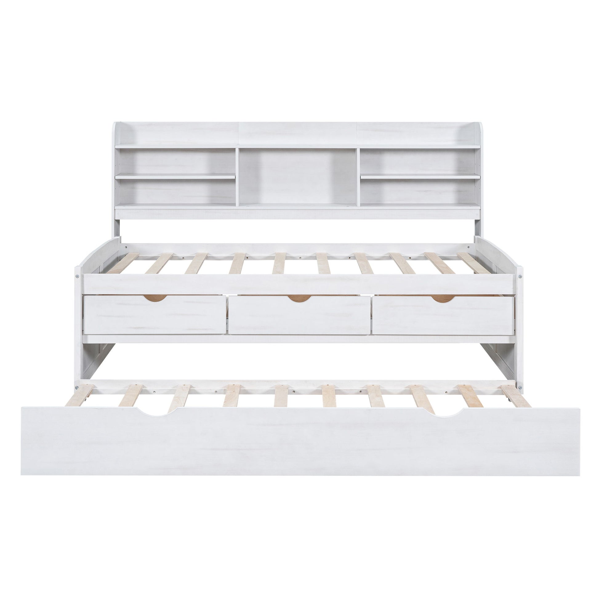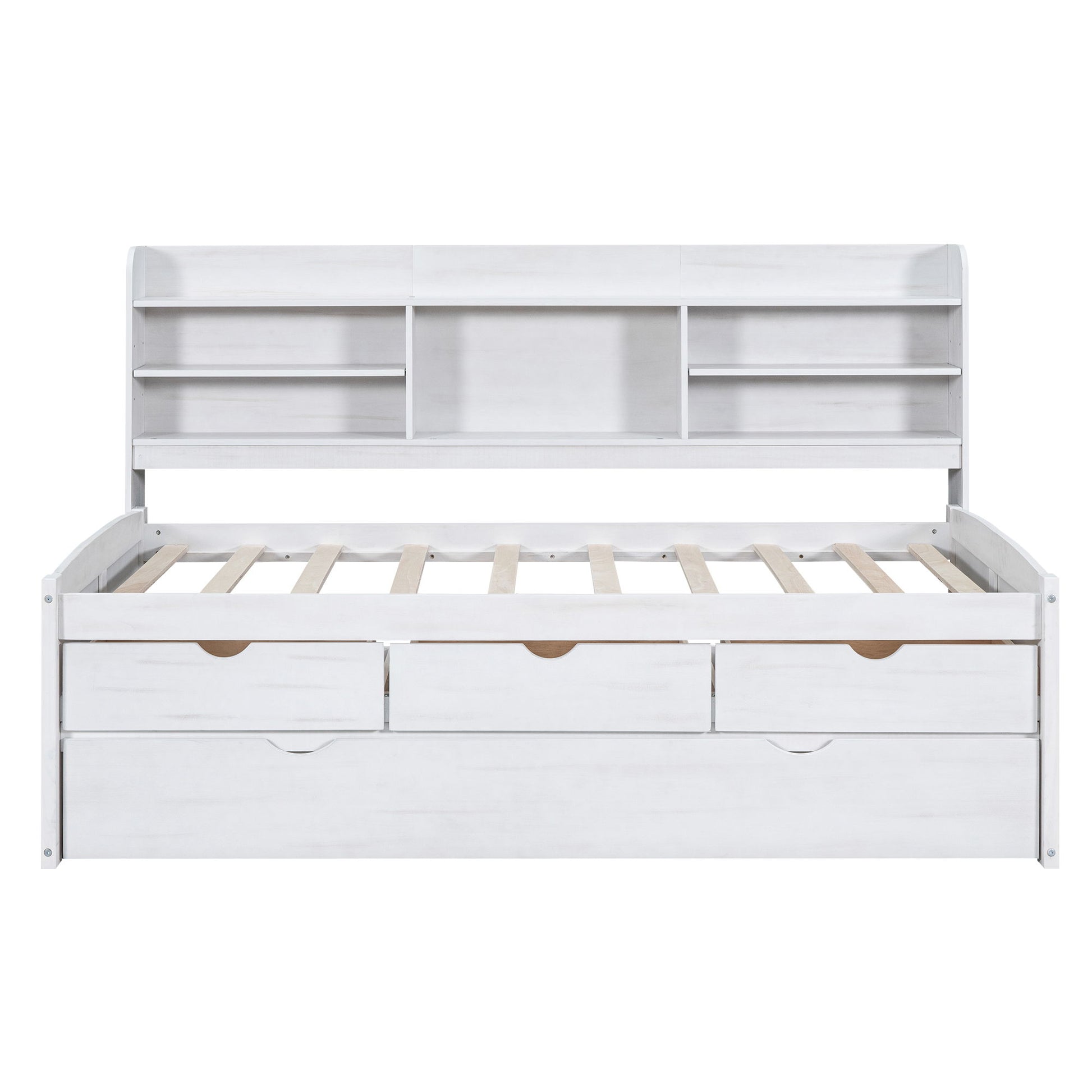 Twin Size Captain Bed With Built In Bookshelves, 3 Storage Drawers, And Trundle - White Washed