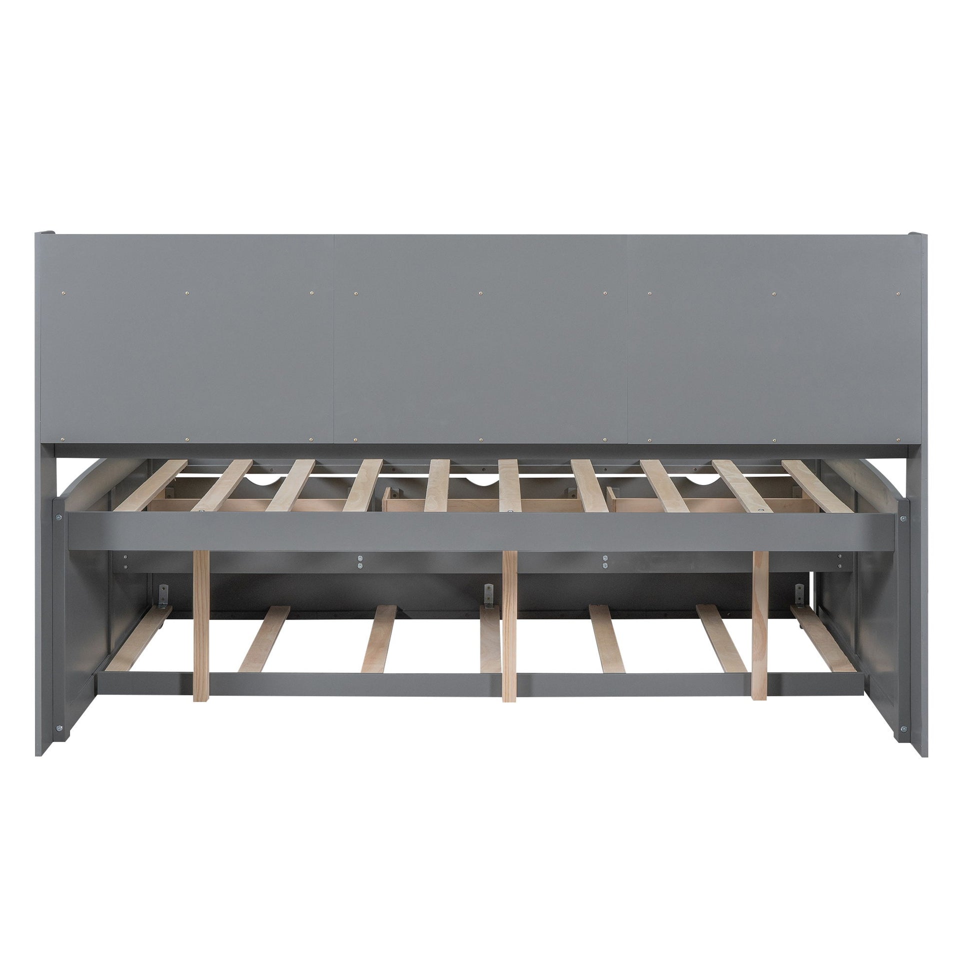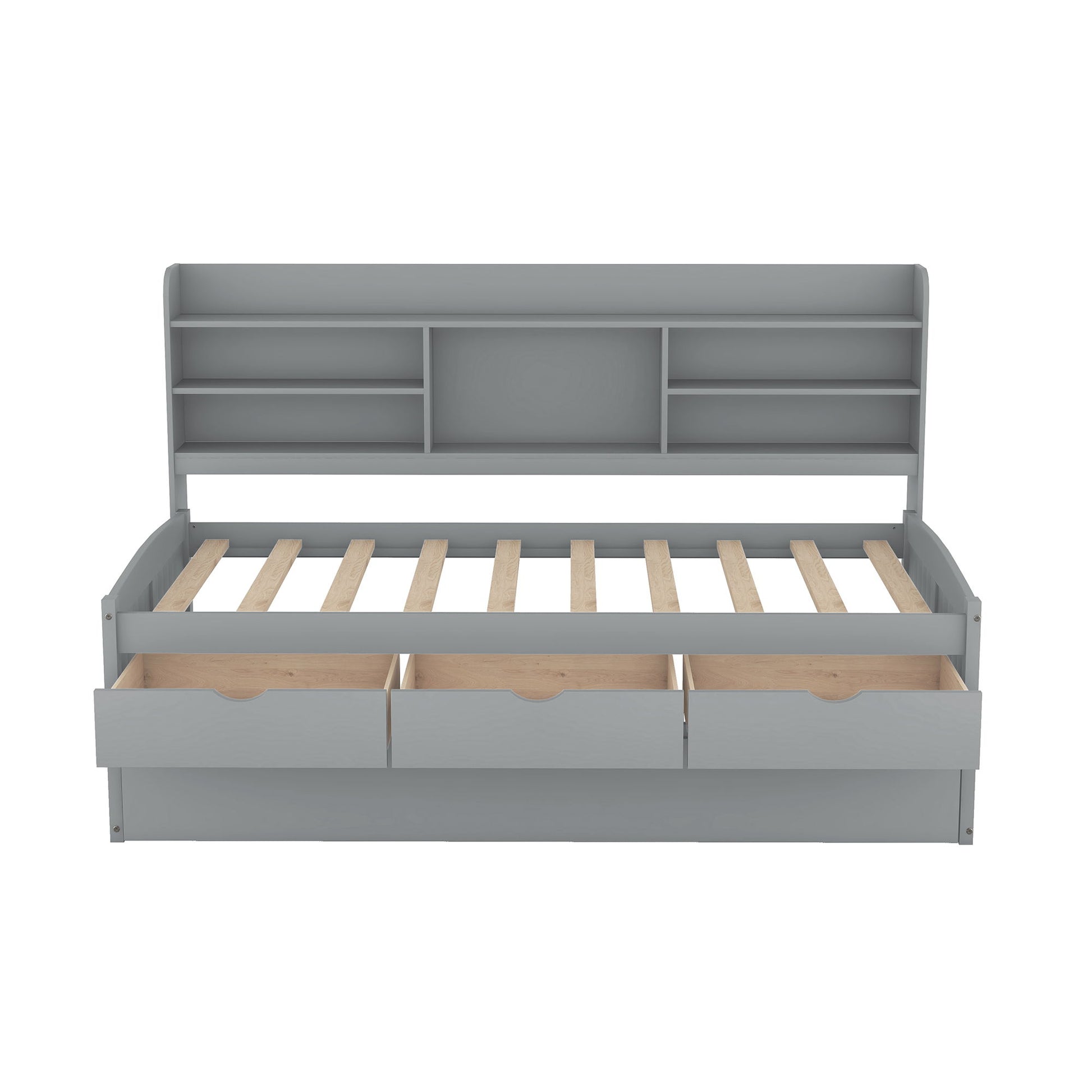 Twin Size Captain Bed With Built In Bookshelves, 3 Storage Drawers, And Trundle - Gray