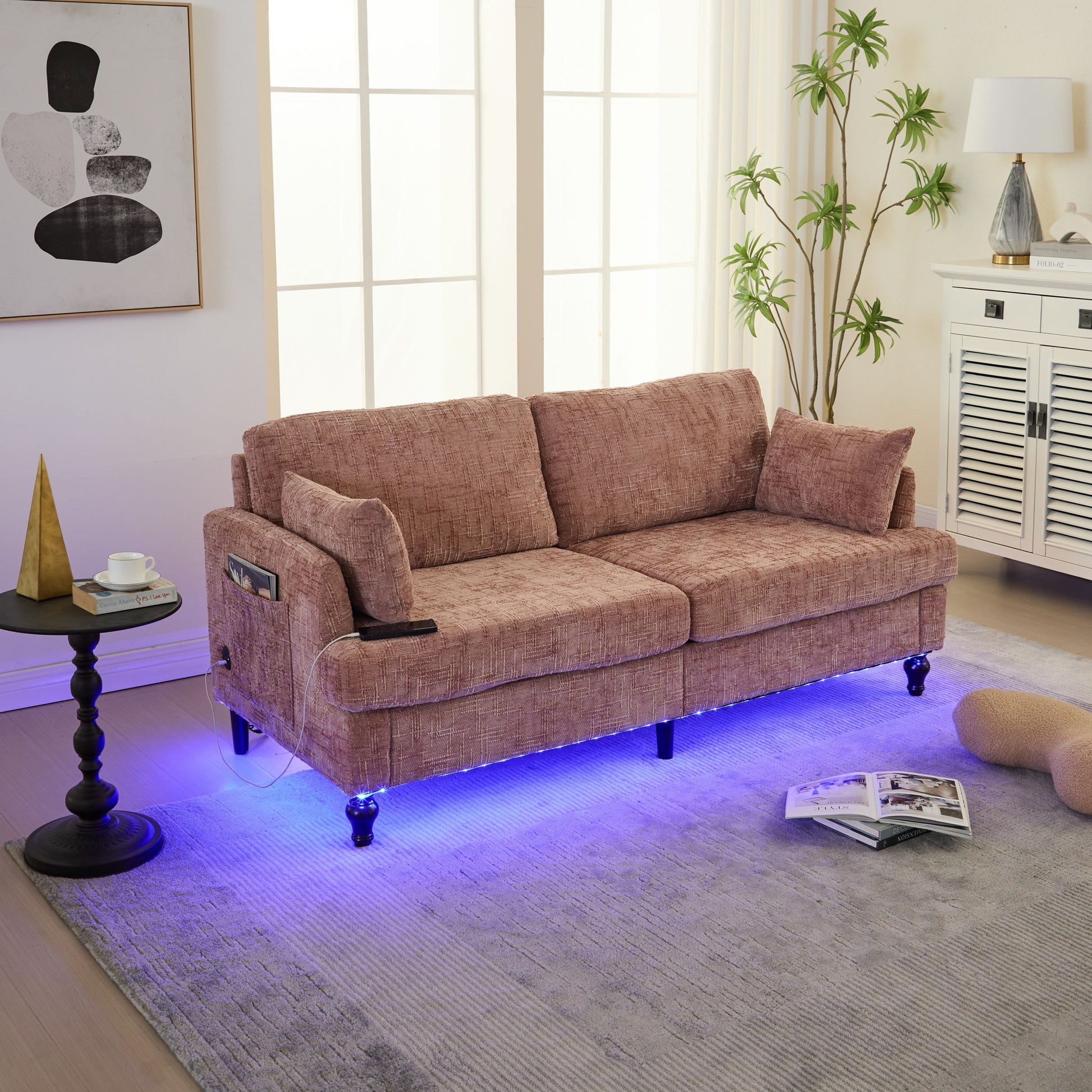 Modern Chenille 2 Seater Sofa With LED Light, USB Port, And Storage Bag - Pink