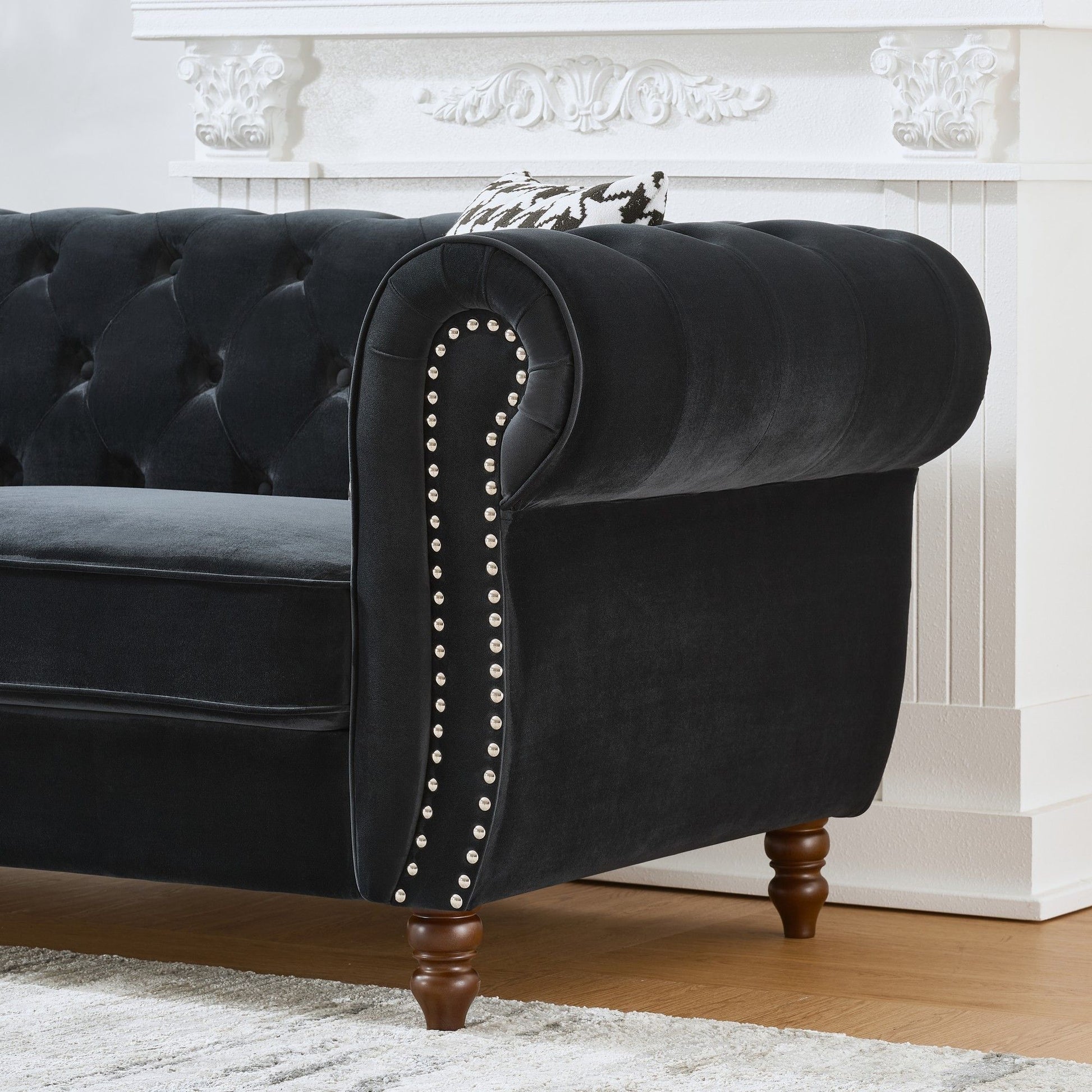 Mid Century Modern Chesterfield Velvet Upholstery Sofa With Roll Armrest & Nailhead, 3 And 3 Seater - Black