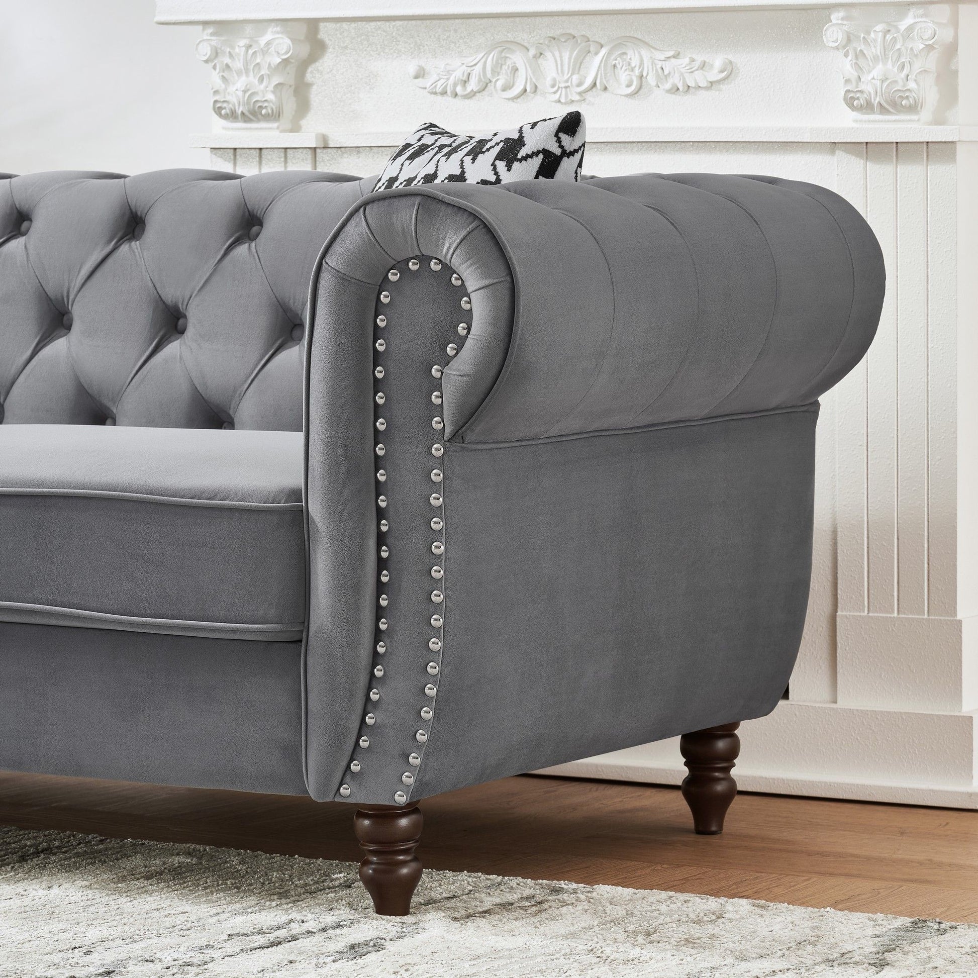 Chesterfield Velvet Upholstery Fabric Sofa With Roll Armrest & Nailhead, Mid Century Modern 3 And 3 Seater Couch - Gray