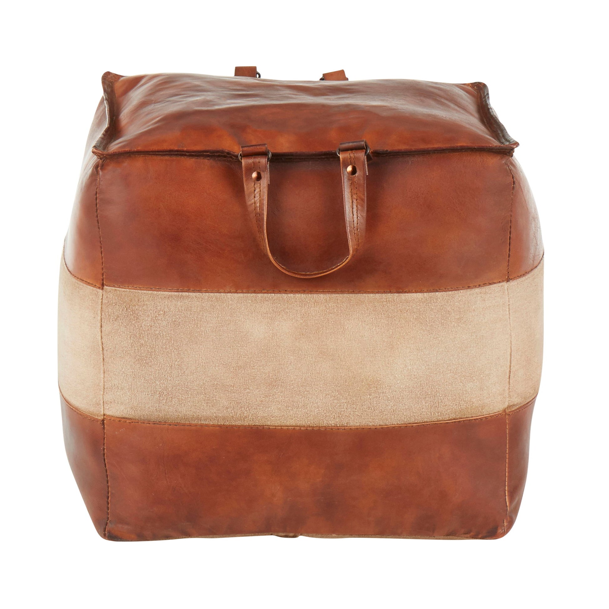 - Quality Materials: Featuring stylish leather upholstery complemented by a canvas accent, this pouf is crafted for durability and aesthetic appeal. The recycled cotton fill ensures comfort and eco-friendliness.