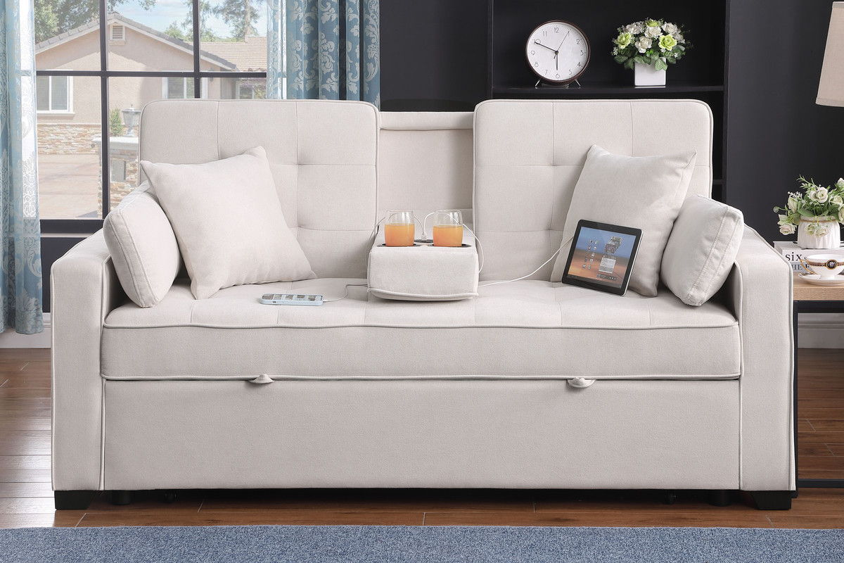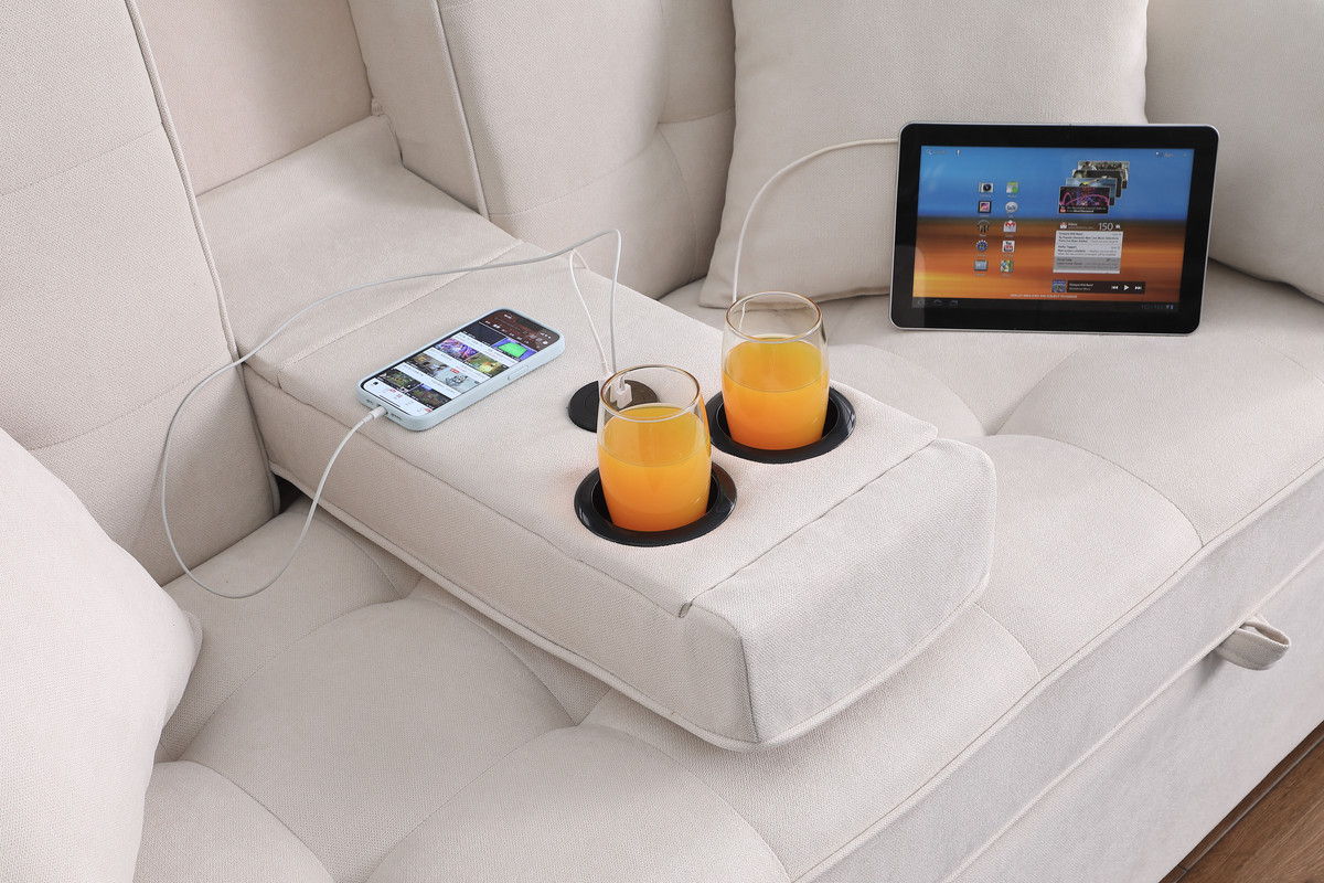 Cody II 70"W Beige Woven Fabric Convertible Sleeper Loveseat with Dropdown Console, Cup Holders, Charging Ports, Pocket, and Pocket Coil Seating
