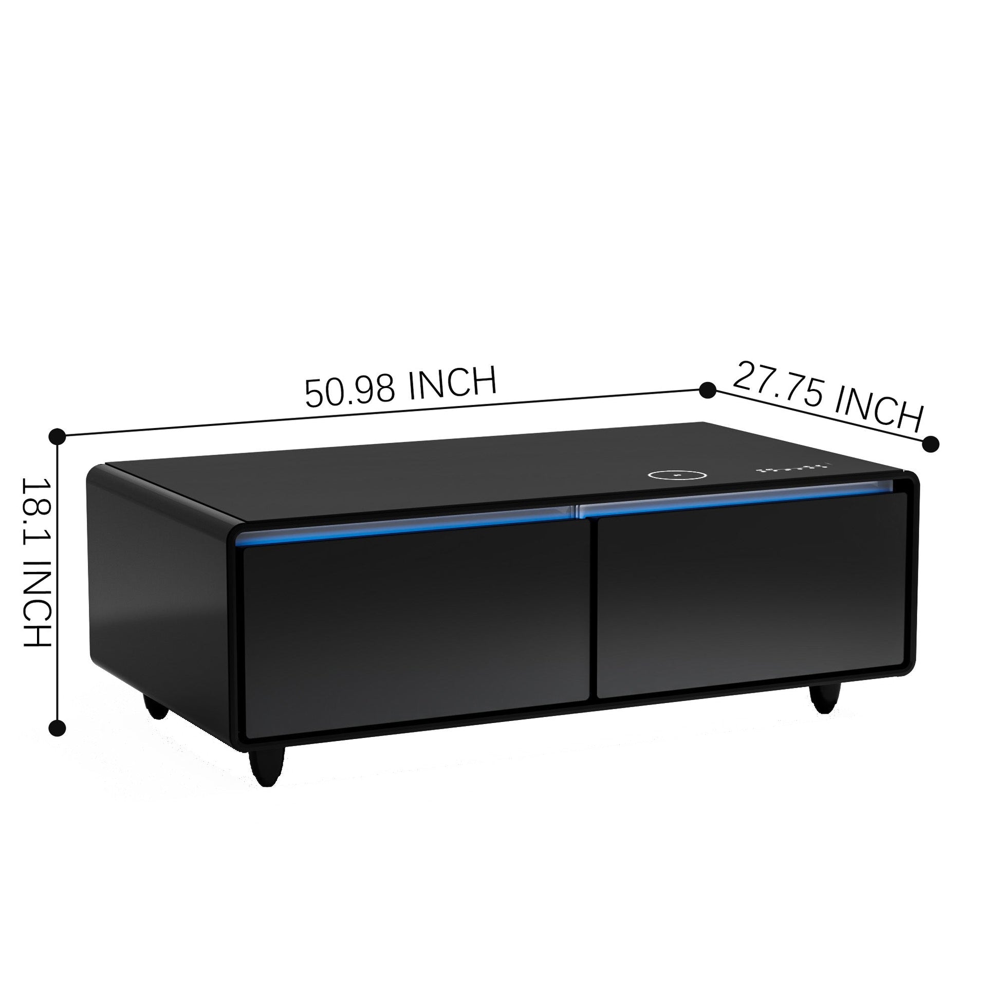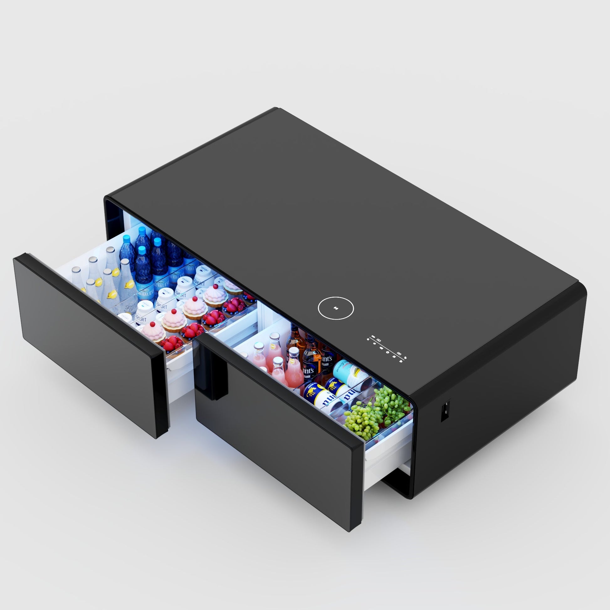 Elevate your living space with the innovative Coffee Table with Two Fridge Drawers for Cooling. This table blends style and functionality, offering cooling and freezing drawers, wireless charging, and power outlets. Models CTA001-006 & CT5011 feature a Bluetooth speaker and atmospheric lamp, while CT5012/5013 include cooling/freezing drawers but lack a speaker. All versions come with a sliding storage box and, for select models CT5011-13 has wheels for easy mobility. Experience seamless control with either a touchscreen or mechanical knobs.
