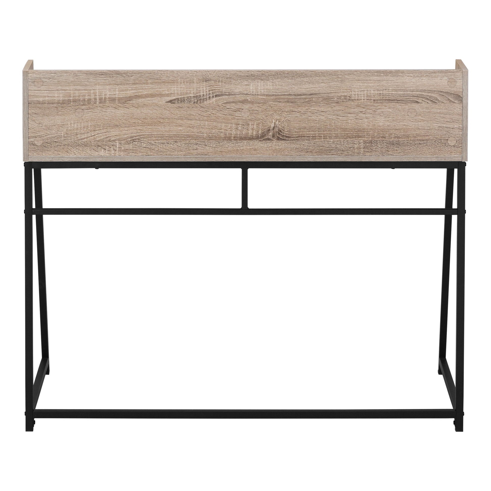 - Sturdy Base: The desk is supported by a robust metal base with trapezoid-shaped legs in a sleek finish, ensuring stability and a contemporary appearance.