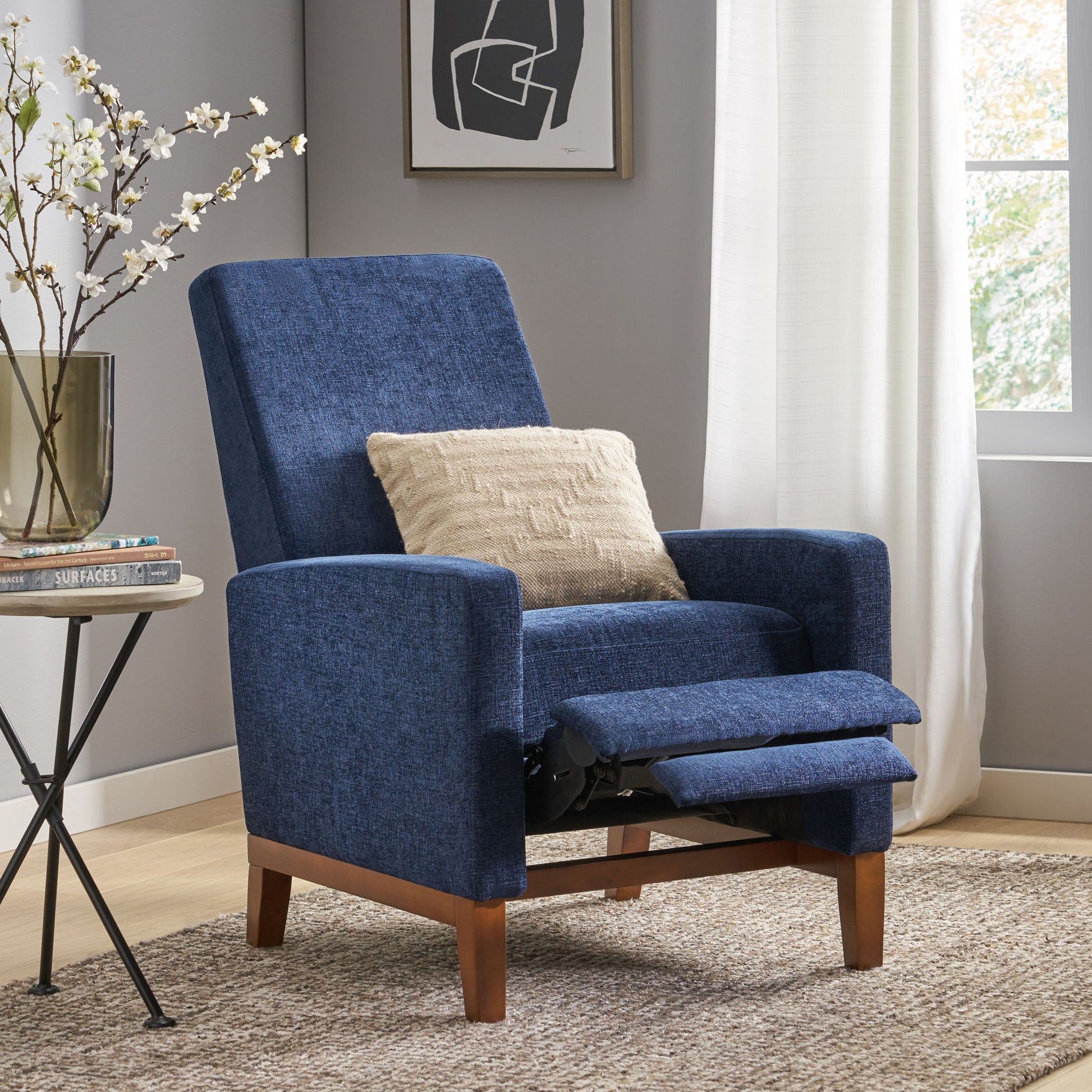 - Contemporary Design: Featuring smooth upholstery and rich wood legs, this recliner offers a minimalistic yet refined structure, emphasizing comfort and functionality.