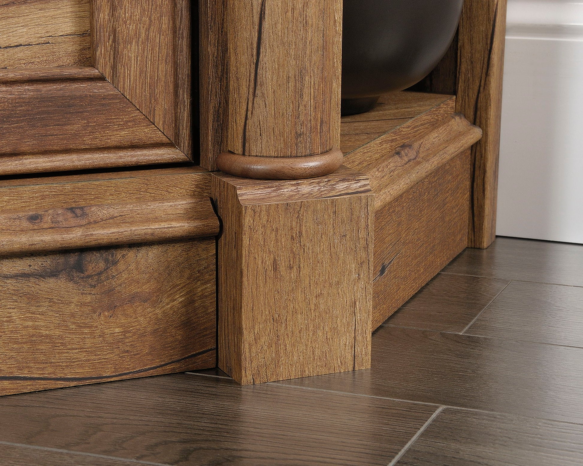 Optimize the space in your living room or entertainment area with this corner entertainment stand from the Palladia collection. Grab the popcorn and cozy up on the couch, this space saving stand accommodates up to a 60" TV making it perfect for all night movies marathons or binge watching that new must-watch show. It features spacious open shelving that includes two adjustable shelves for you to store all your video and gaming equipment. It also features an adjustable corner display shelf on each side so you can showcase your chic home décor. The two easy gliding drawers open and close on smooth metal runners for easy access storage of books, movies, and board games. The enclosed back panel includes cord access to keep your wires neatly organized and out of the way. Finished in a beautiful Vintage Oak and accented with black hardware, this good looking TV stand adds style and functionality to any room in your home.