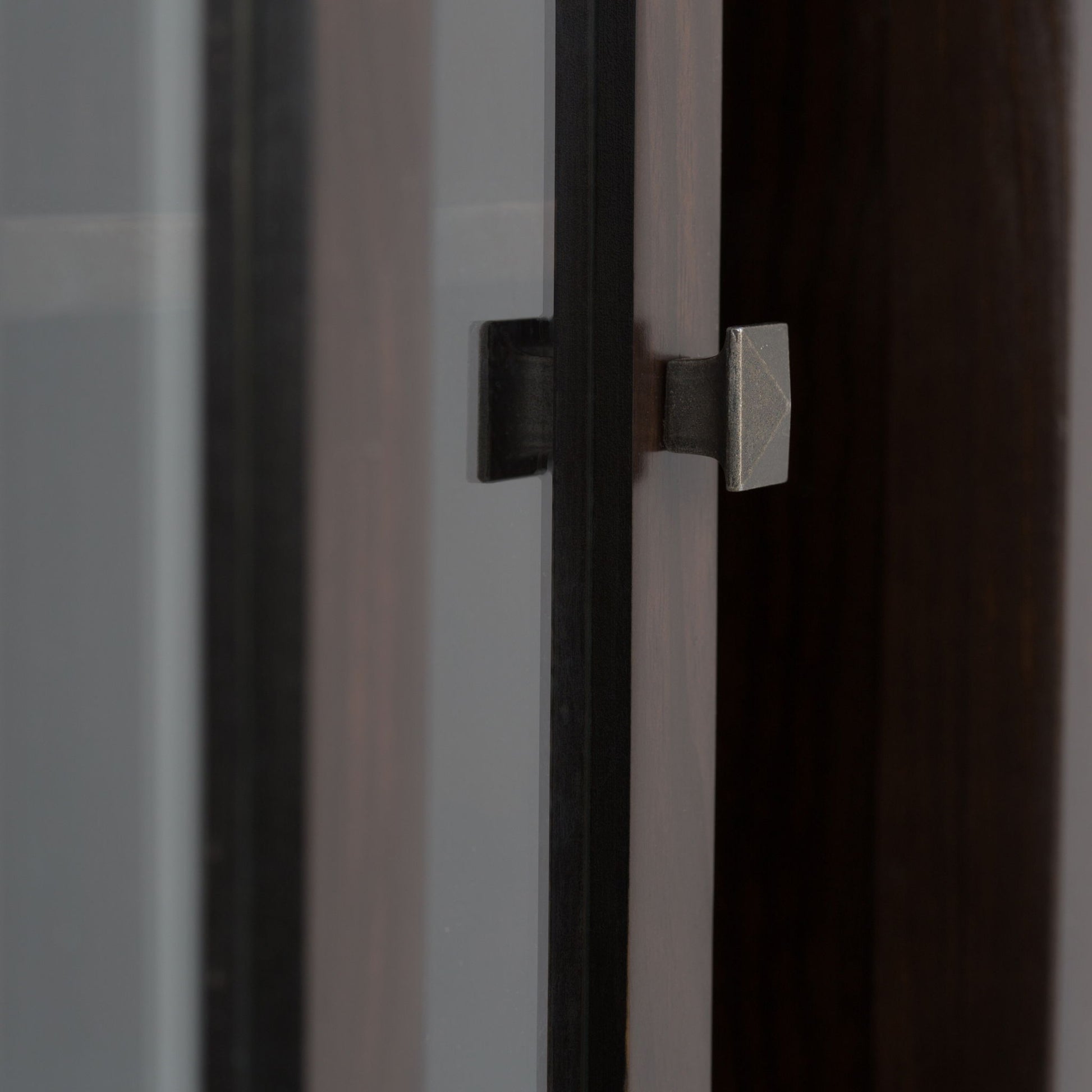 - Contemporary design includes floating square edged top, square knobs with bronze finish and square tapered legs