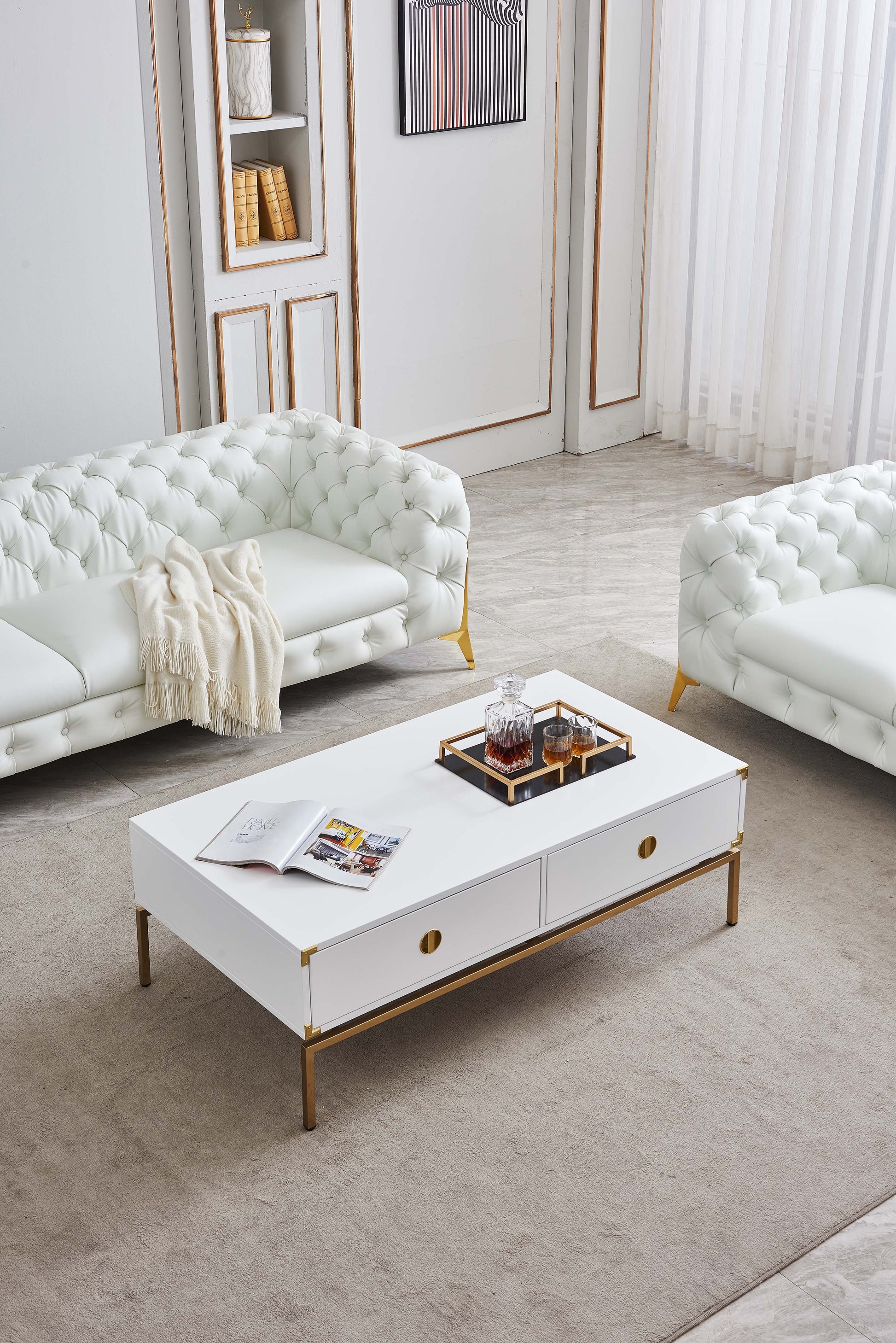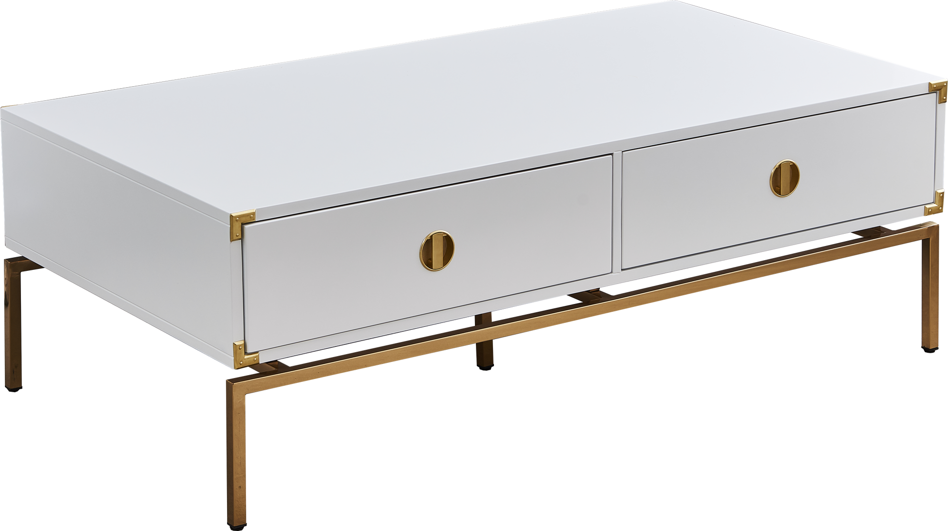 The CT001 Coffee Table brings a touch of modern elegance to your living space. Crafted with a high-quality MDF surface finished in white lacquer, it features a stunning stainless steel base with a gold mirrored finish that adds sophistication and subtle shine. Measuring 51.2"L x 27.6"D, this coffee table offers generous space for all your essentials while complementing modern interiors. Arriving fully assembled, it’s ready to enhance your décor with ease and convenience.