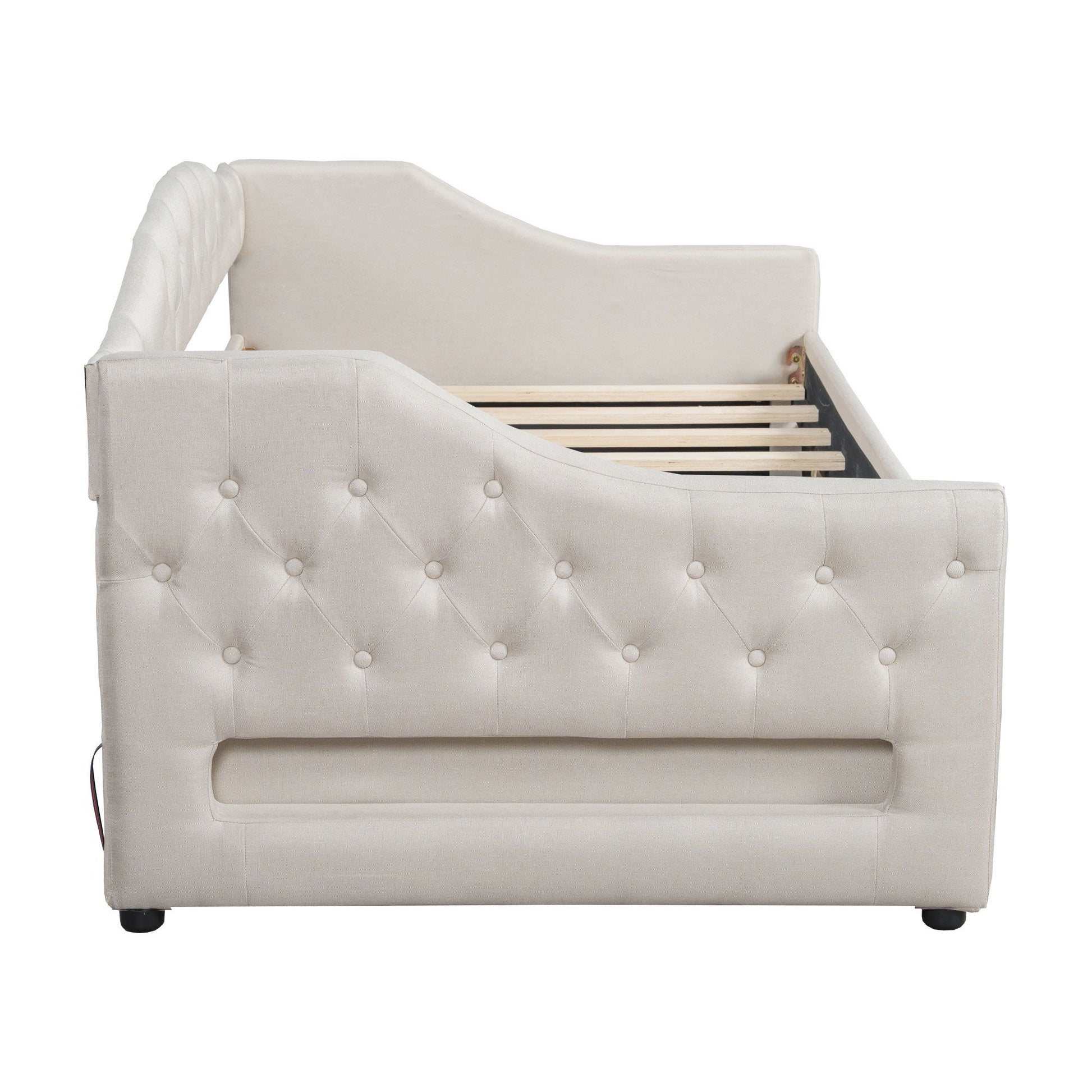 Twin Long Size Daybed With LED Belt, Trundle - Beige