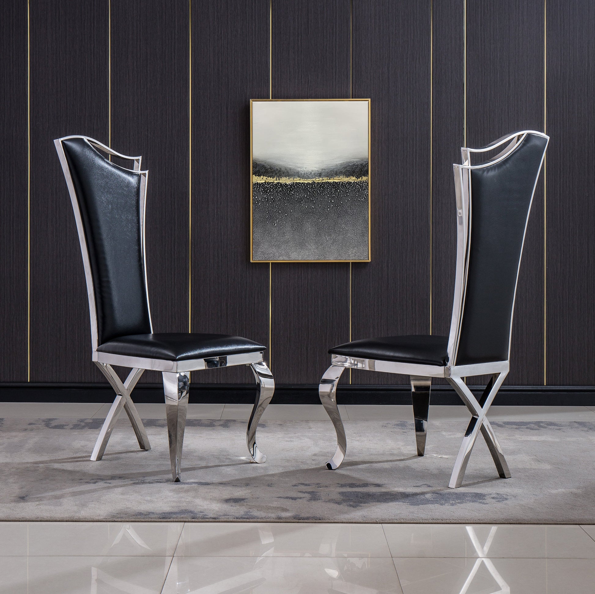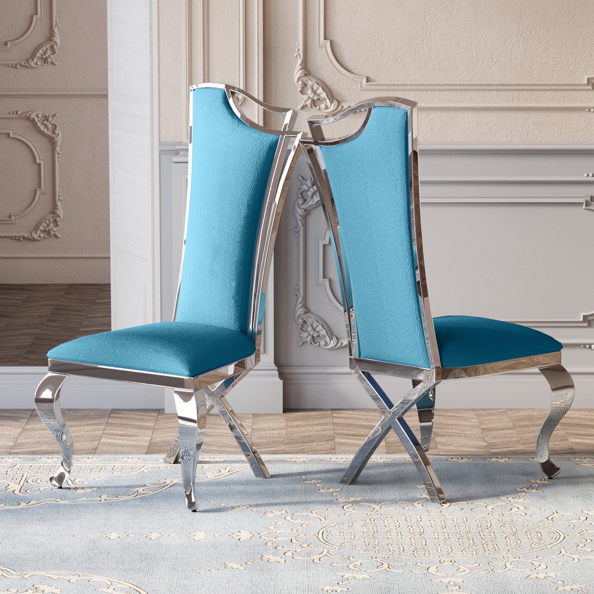 Elevate your dining experience with this sophisticated Dining Chair Set of 2. Available in luxurious Grey/Blue velvet or sleek White/Black leatherette, these chairs add a touch of elegance to any dining space. Each chair is designed with a stainless steel frame and a gold/silver mirrored finish that enhances its modern appeal. The overall size of 20.9"L x 26"D x 48"H ensures both comfort and style.