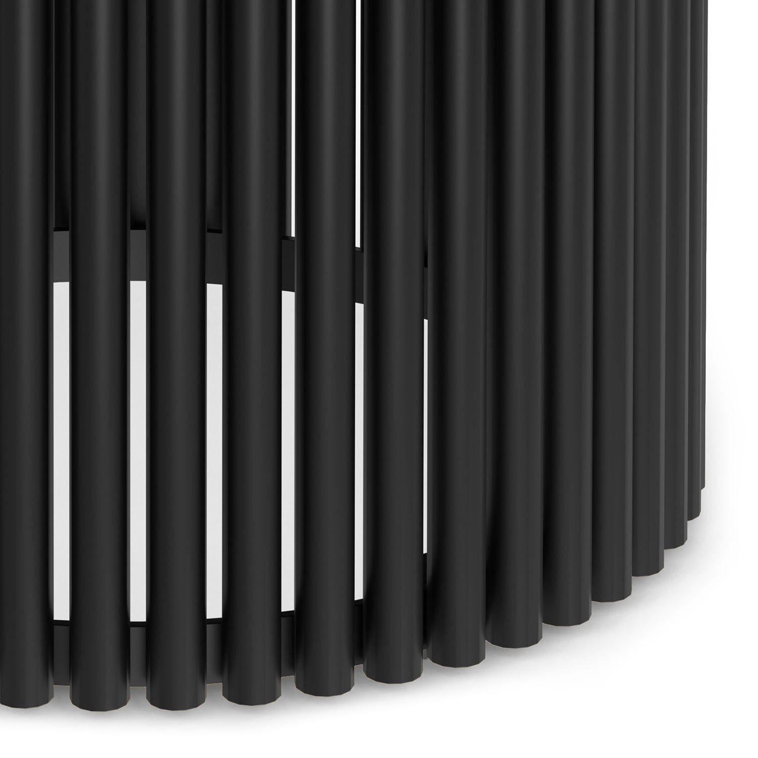 - Features solid wood table top and tall cylinder shape with unique pipe design base