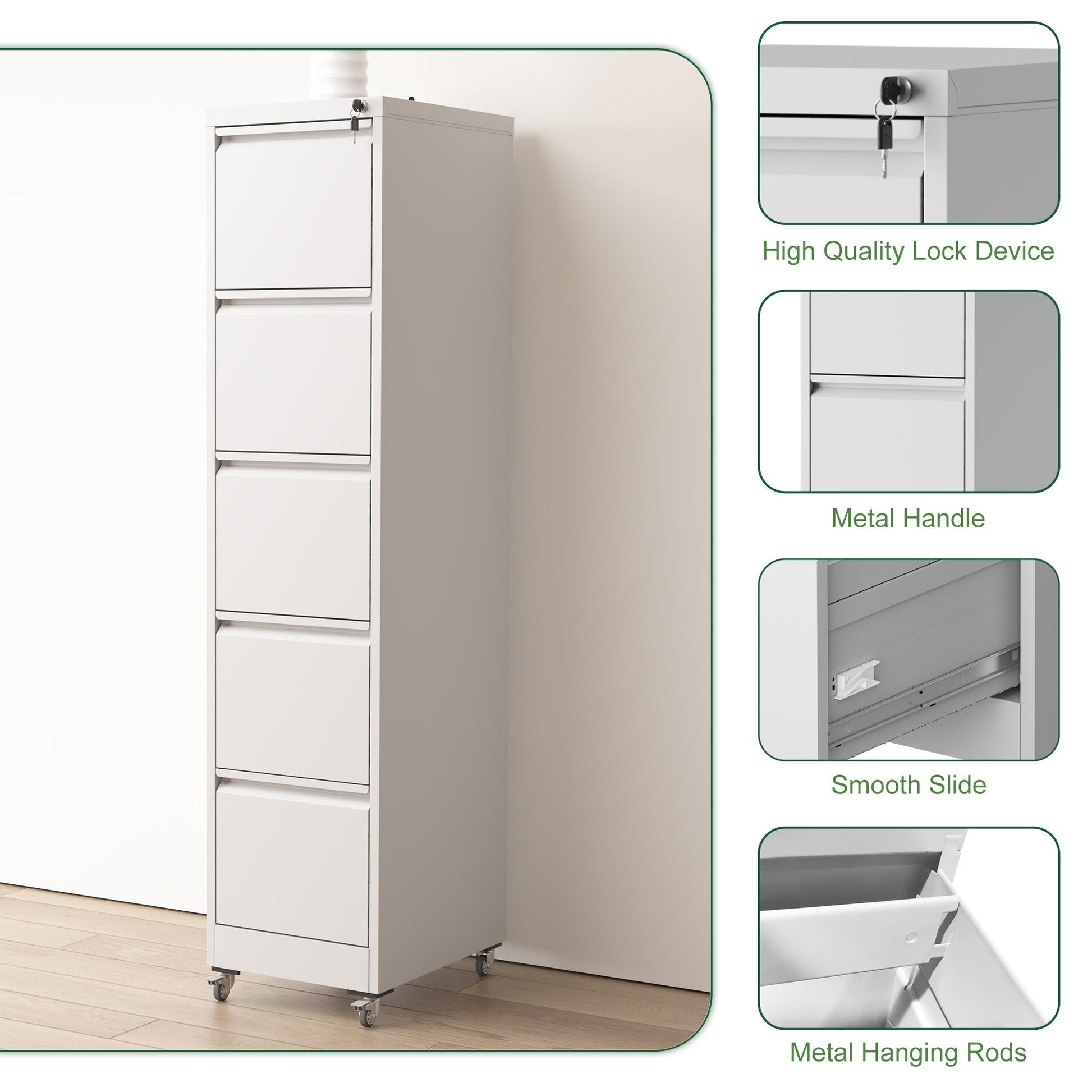 Heavy Duty Metal 5 Drawer Vertical File Cabinet With Lock And Wheels For Home Office - Brushed Nickel
