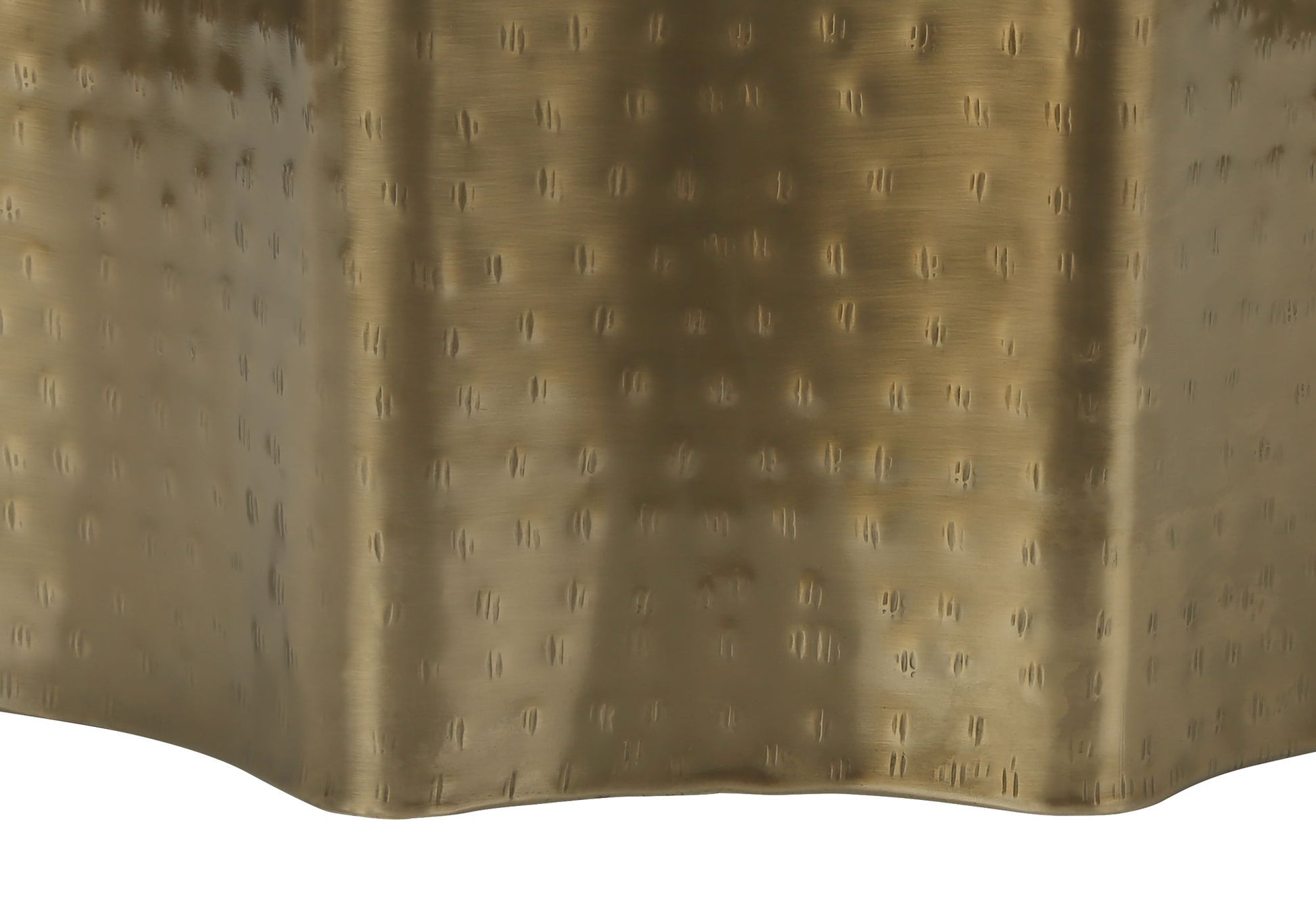 - Design and Finish: This drum table features a stylish scalloped design with a hammered texture, finished in an antique metal. It adds an eye-catching boho glamour to any living room or bedroom setting.