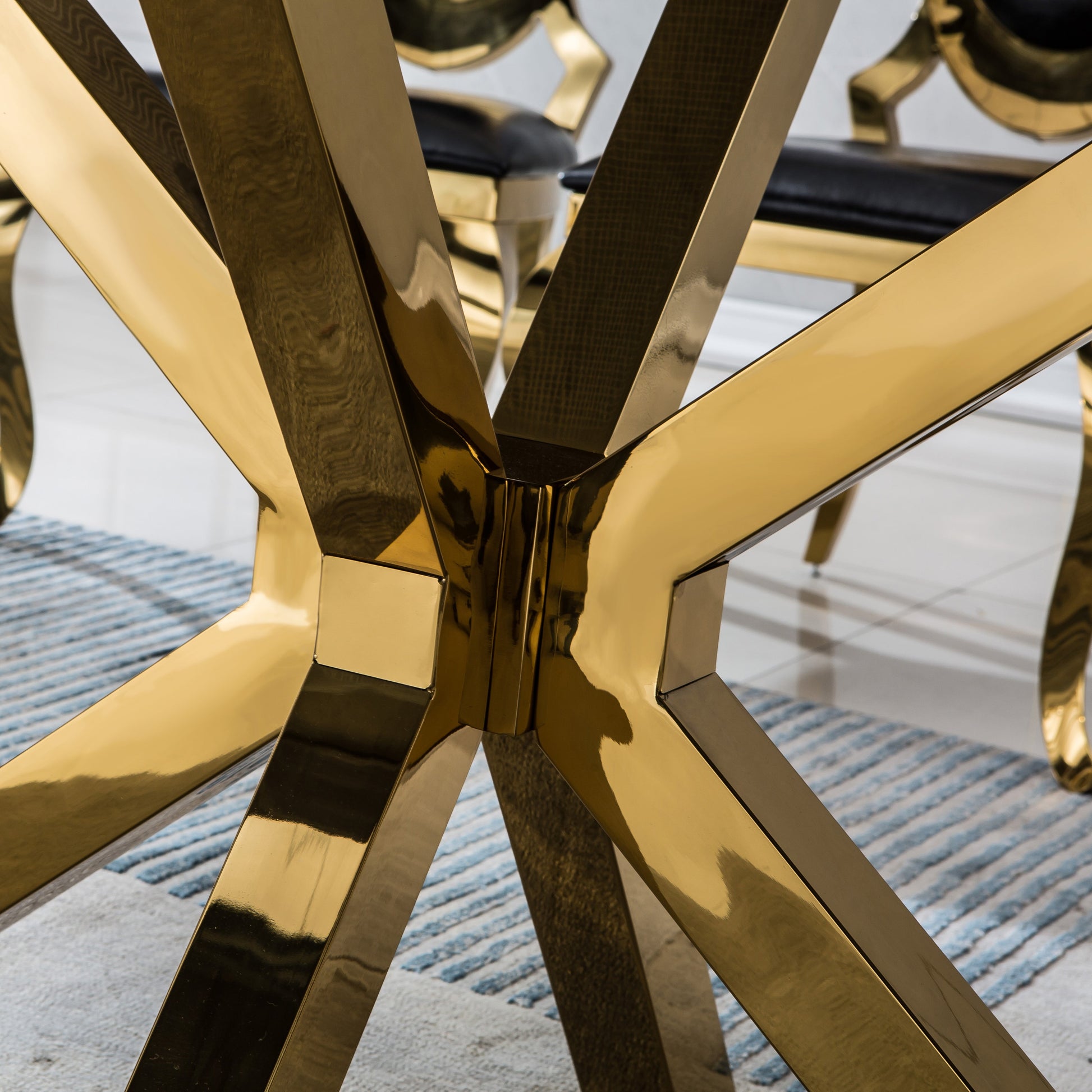 Elevate your dining space with our Elegant Rectangular Dining Table, featuring a sophisticated black marble with a luxurious mirrored finish. This stunning table is crafted from durable stainless steel, ensuring both style and strength. Its sleek design complements modern interiors, while the gold mirrored finish adds a touch of opulence. The table measures 63"L x 35.4"D x 29.9"H, providing ample space for dining and gatherings. Please note, assembly is required.