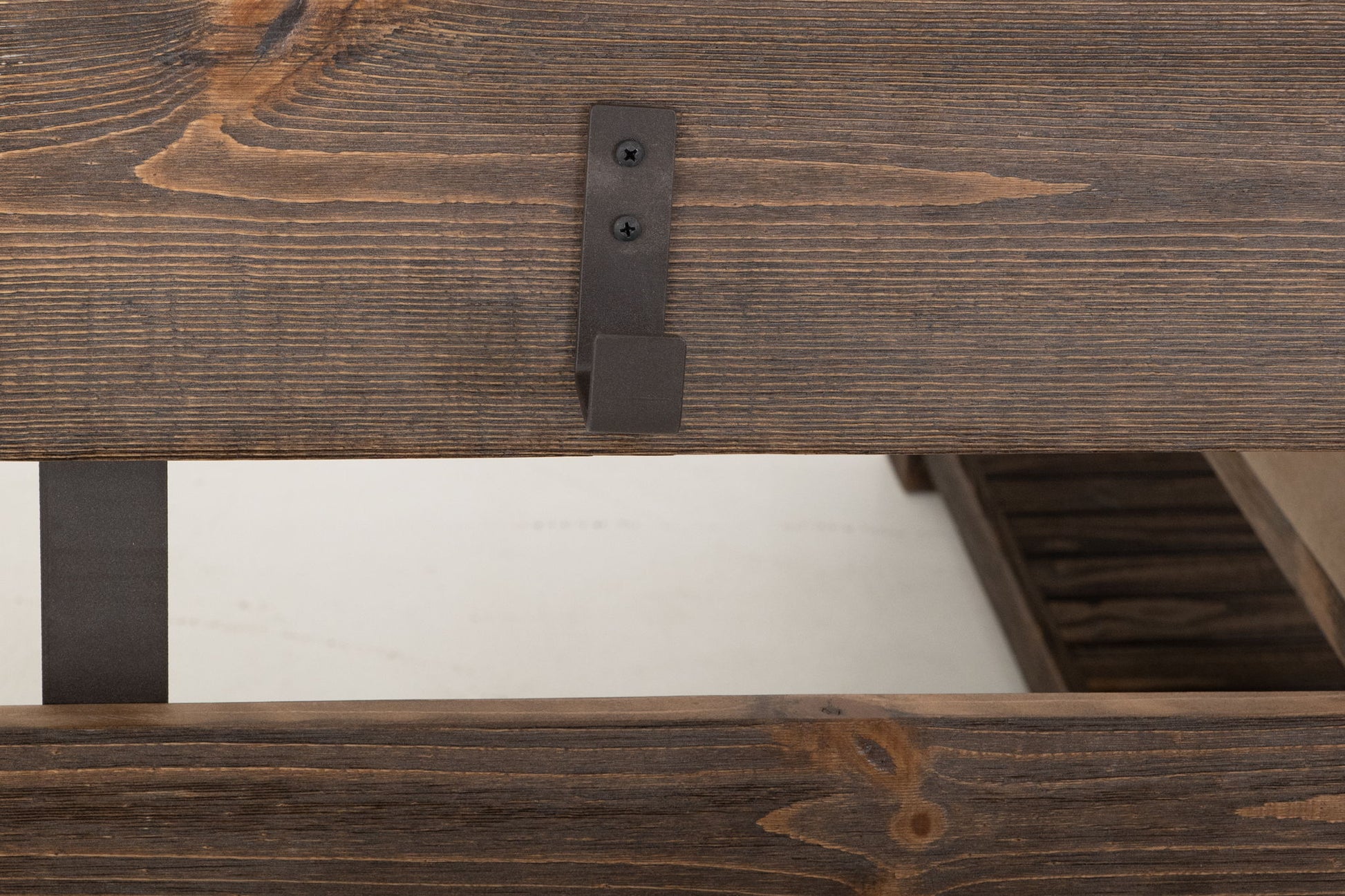 - Lightly distressed wood with a brown multi-step lacquer finish.