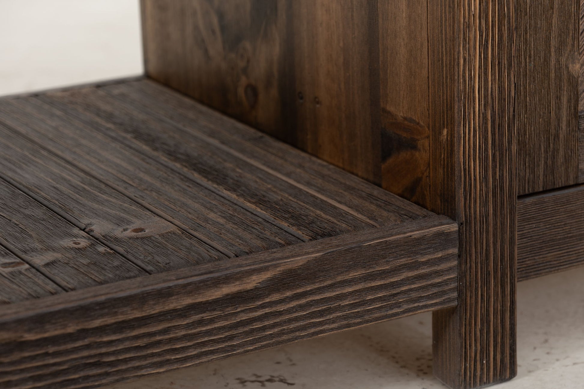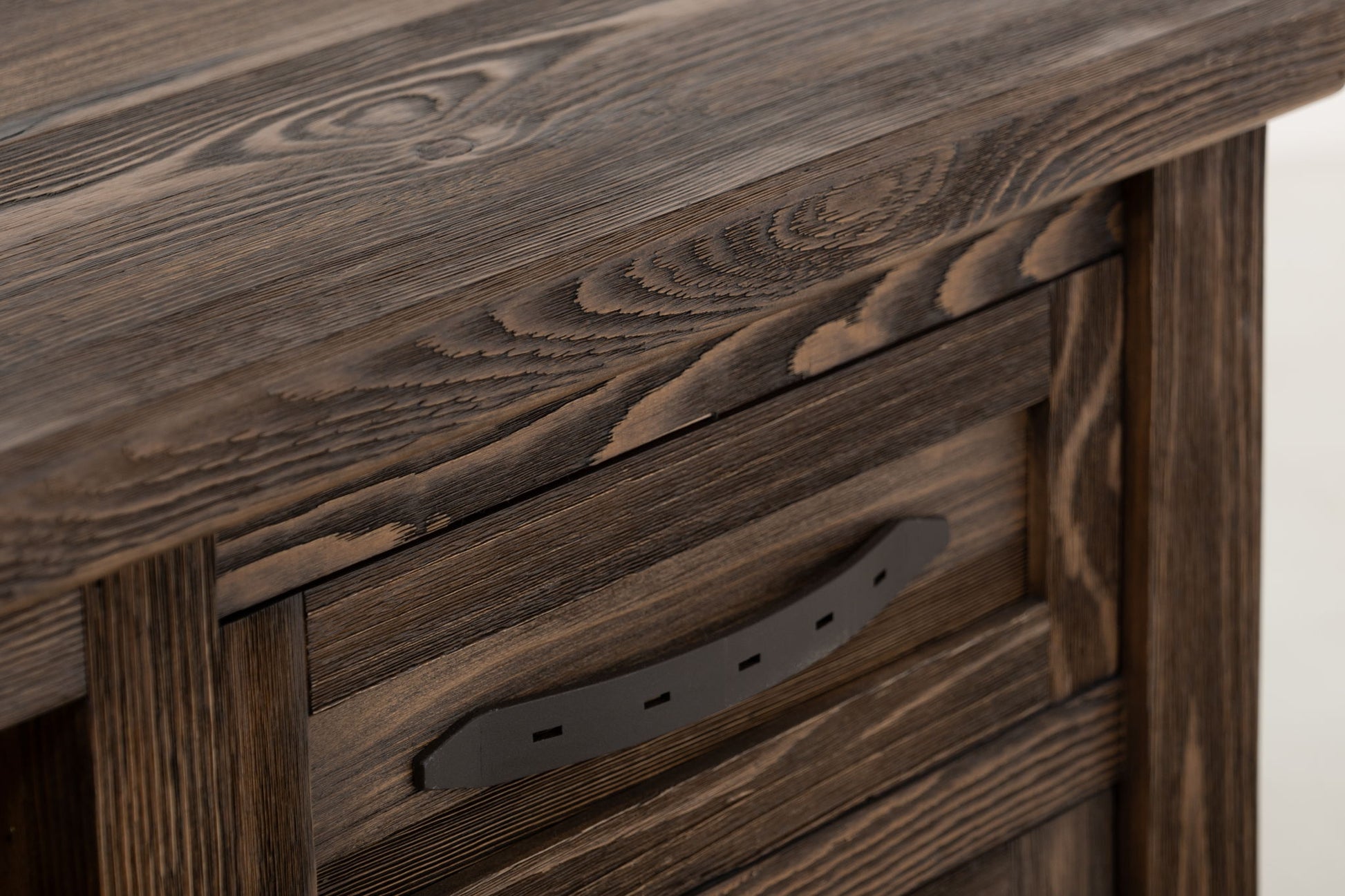 - Lightly distressed wood with a brown multi-step lacquer finish.