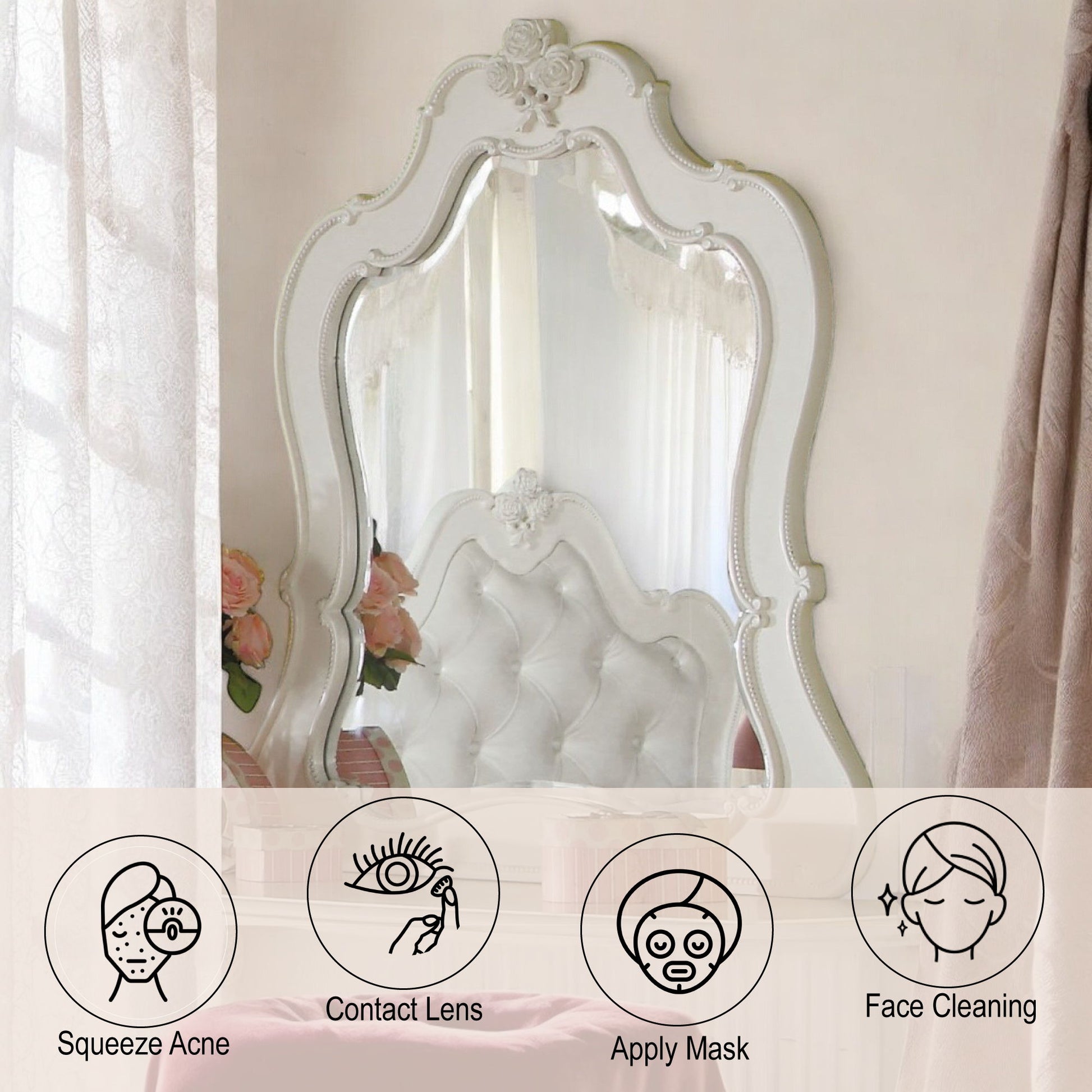 - Elegant Design: The Edalene Pearl White Finish Mirror features a graceful arched silhouette with intricate scrolled trim and a rose crown decor, adding timeless sophistication to any room.