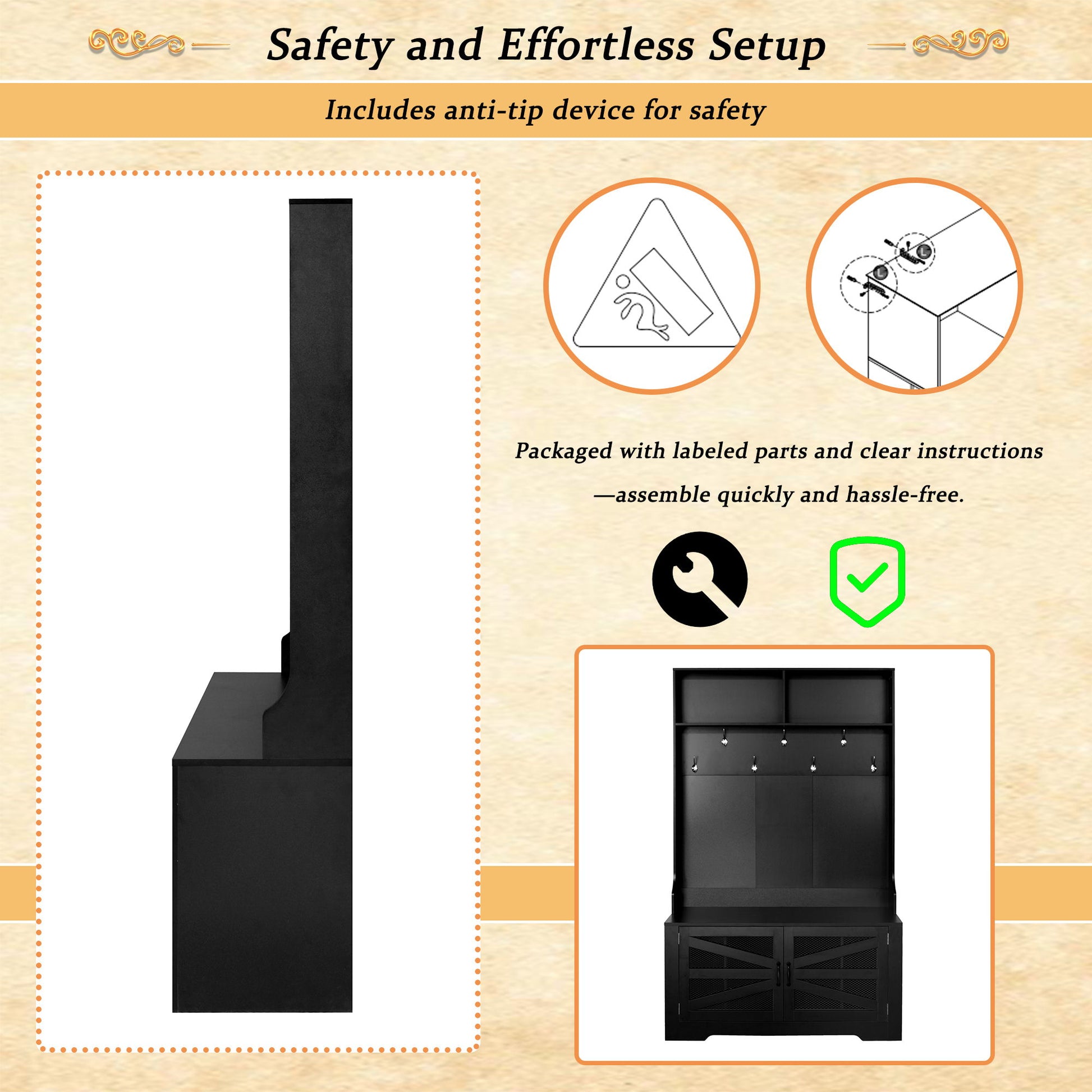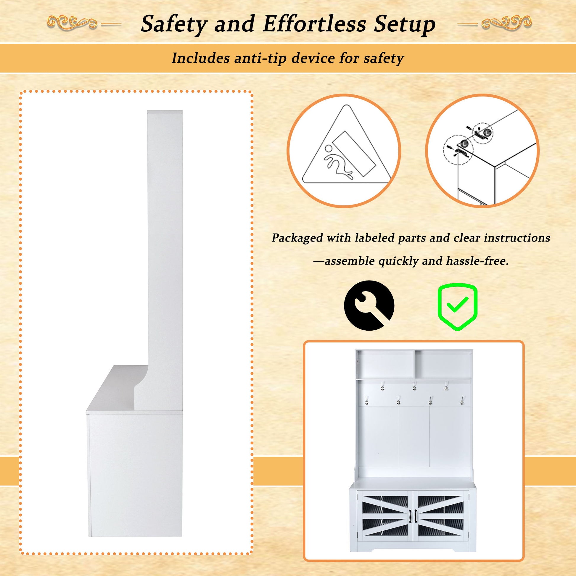 - Easy Assembly and Safety Features: The product includes an anti-tip device for added safety, with all parts labeled and accompanied by illustrated instructions for straightforward assembly.